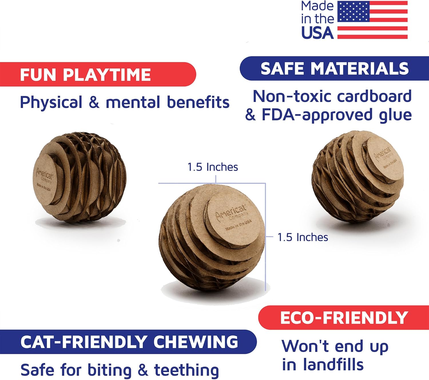- SAFE TOYS: Cat ball toys made in America from industrial-strength cardboard and foodsafe, vegan glue. No chemicals or dyes. Safe toys cats can chew, chase, and carry without worry. Beware of other cat toys with unsafe materials, smells, and small parts that become choking hazards