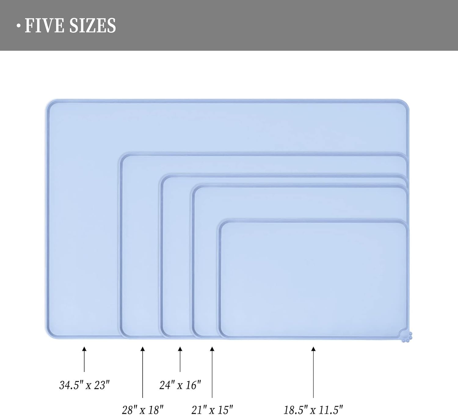 - Various sizes available: our pet mats come in 5 different sizes - 18.5" x 11.5", 22" x 14", 24" x 16", 28" x 18", and 32" x 24". Suitable for all kinds of pets, from puppies to large pets, choose the perfect size for your furry friends and avoid messy spills at mealtime