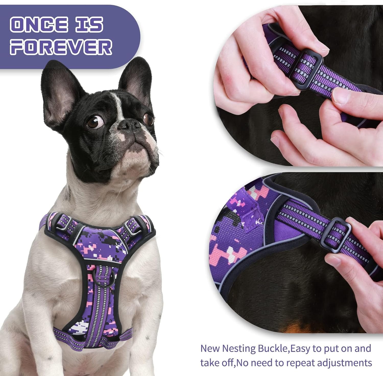 No Pull Dog Harness for Large Dogs, Adjustable No Choke Pet Vest with Dog Leash Fit Smart Reflective Pet Walking Harness for Training Easy Control Soft Handle Purple Camo L