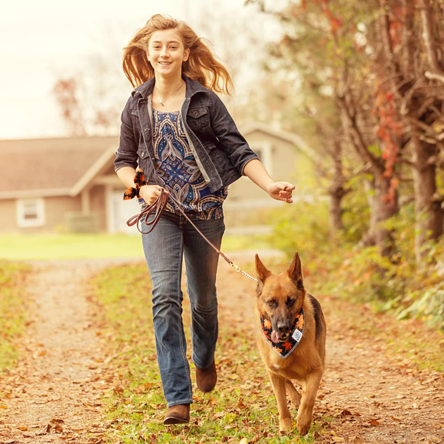 - Matching Dog and Owner- It’s so cool and lovely, dog mom and dogs are wearing the matching costume together. When traveling, daily walking, or taking photos, adorable dog bandanas girl with scrunchie is both fashion and personalized dog matching owner accessories. The bow scrunchies can be worn as a wrist accessory, or as a ponytail holder hair band . Beautiful dog and human matching clothes set with orange red brown fall leaf print, it’s nice fall themed photo props.