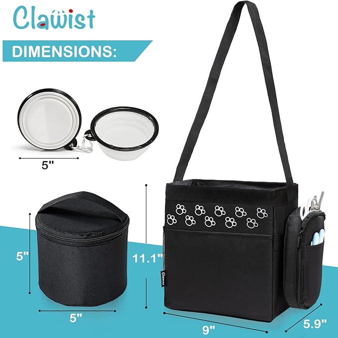 - DURABLE AND STYLISH - Clawist dog travel bag Made with premium materials, this travel organizer kit for pets holds all your fur baby’s essentials: dog food, treats, a water bottle, toys, and other dog travel accessories
