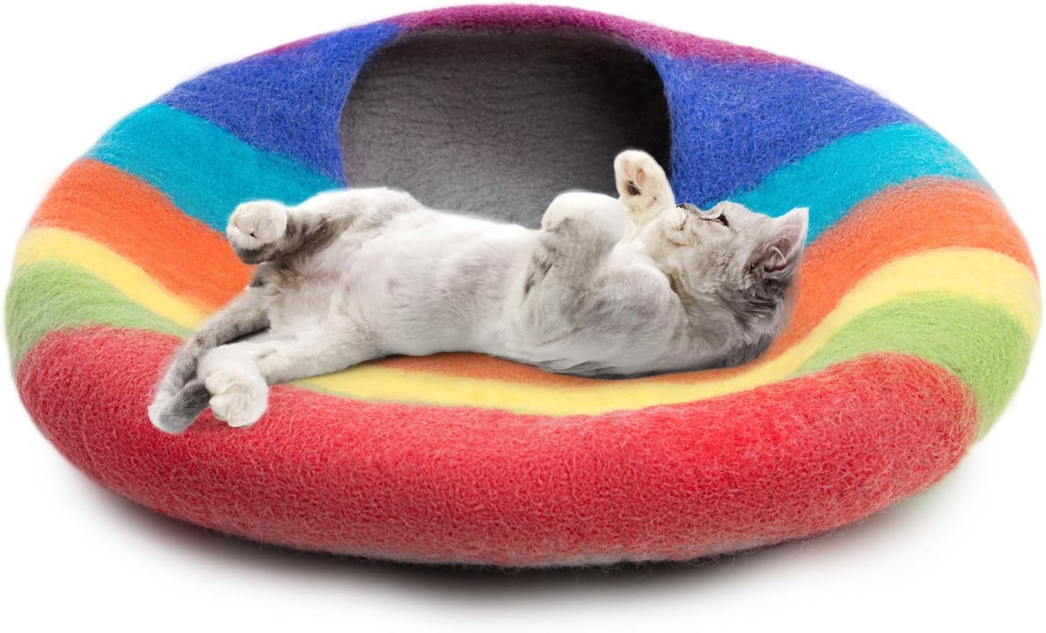 Woolygon Premium Felt Cat Cave Bed – Wool Kitty Beds Handcrafted Kitten Caves Bed for Indoor Cats - Made from 100% Eco-Friendly Merino Wool, Foldable Cat Hidewawy Covered Cat House Pod (Rainbow Twist)