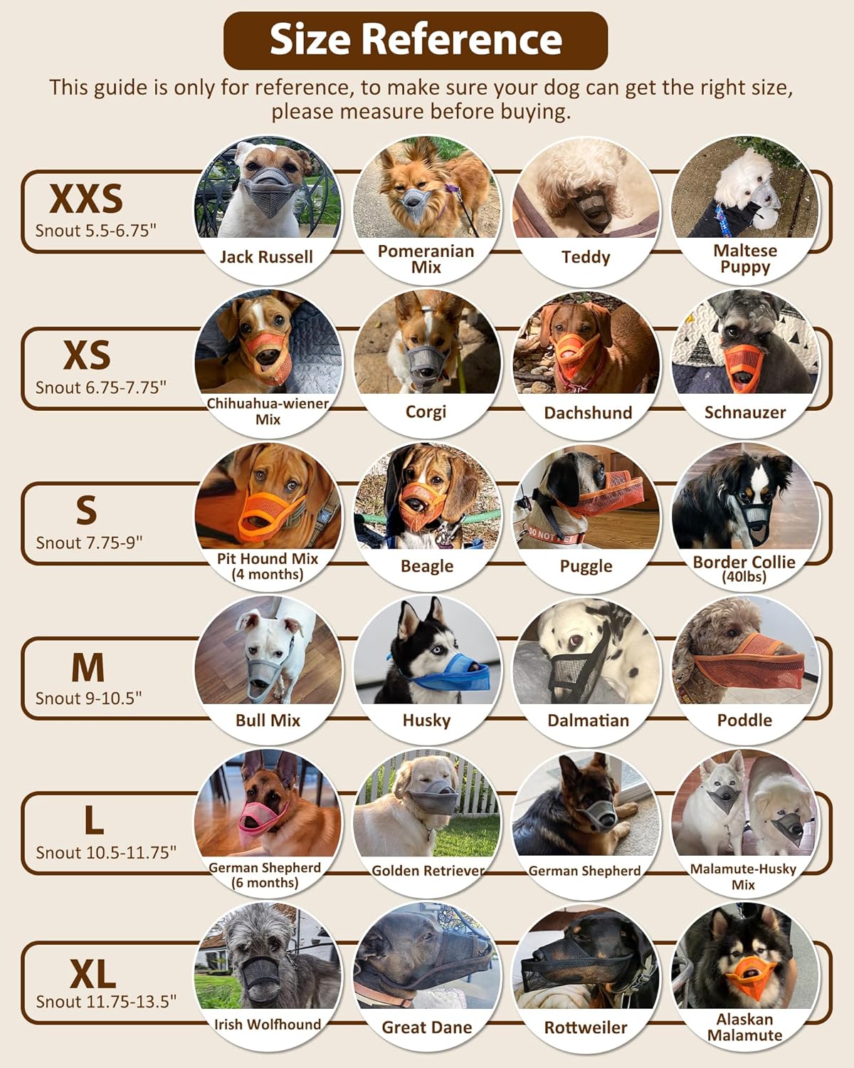 - Muzzle for Small Dogs: The selected size is XS, with snout circumference of 6.75'' to 7.75''. Suitable for Standard Poodle, Cocker spaniel, Jack Russell Terrier, etc. Every dog’s snout is unique, please Measure Before Purchasing. Don't select a size based on breed or previous orders. If your dog's measurements are between two sizes, please choose the smaller size. (Note: Not for fierce dogs, overactive dogs, or short-snout dogs.)