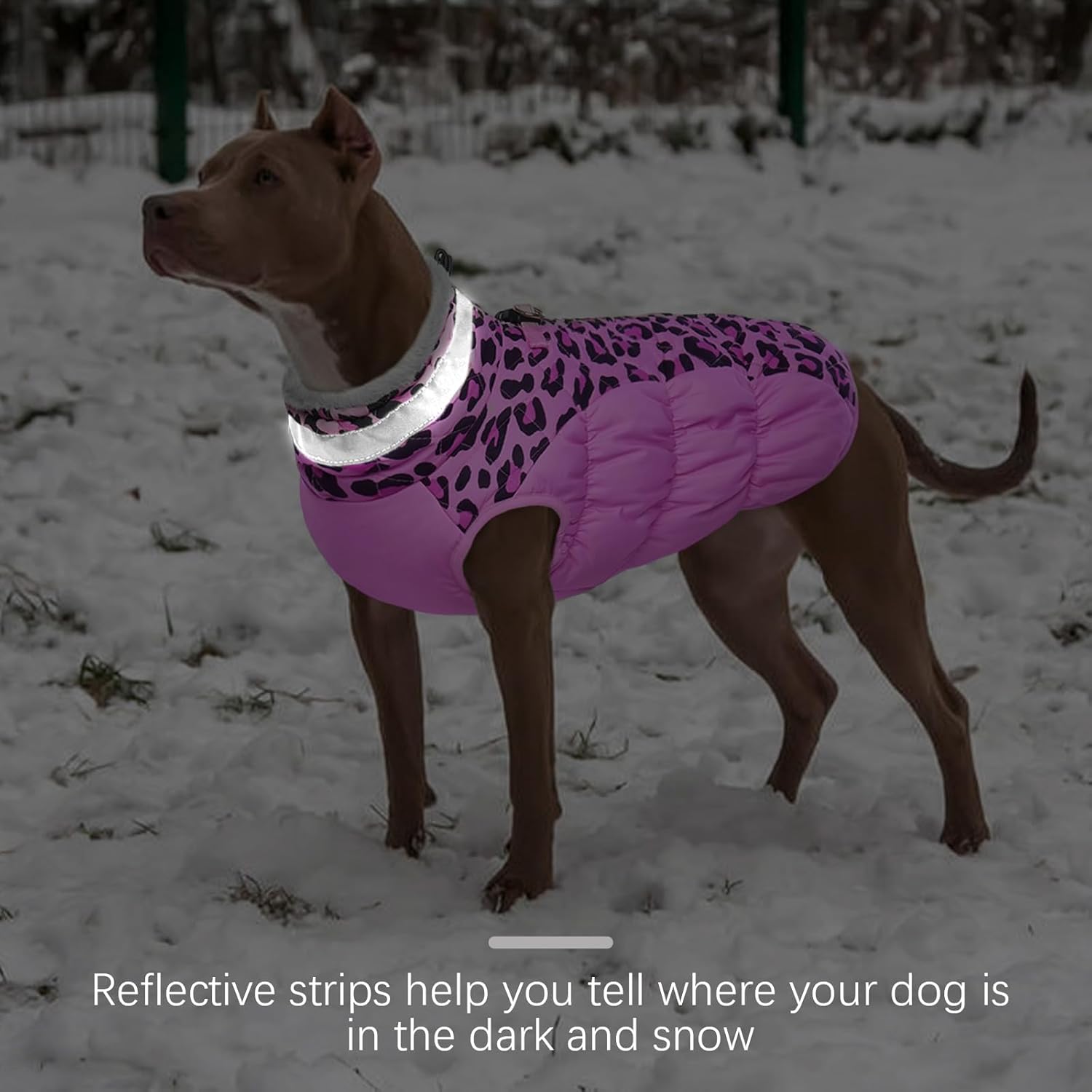FUAMEY Dog Coat for Large Dogs,Waterproof Dog Winter Jacket with Harness Built in Puppy Cold Weather Coats Reflective Pet Vest with Zipper Warm Fleece Dogs Snowsuit Windproof Pink Leopard XXXL