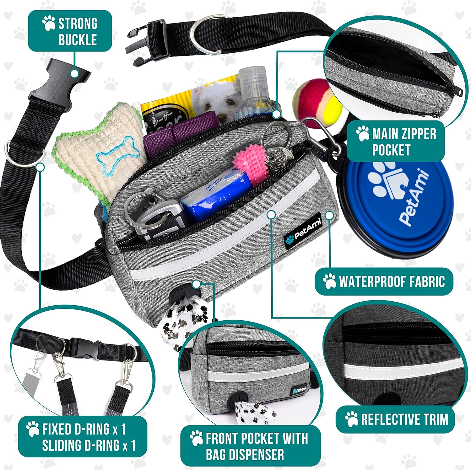 - ADJUSTABLE DOG TREAT TRAINING POUCH: Our wrap around dog hiking fanny pack strap is adjustable from 28 inch to 52 inch to provide a perfect fit for easy walking, backpacking activities with your pet. Featuring a double clip, one fixed and one movable attachment for attaching additional harnesses and waist leash allow for walking 2 dogs. Enjoy walks or runs with ease with PetAmi waist zipper pouch with dog belt leash for your dogs.