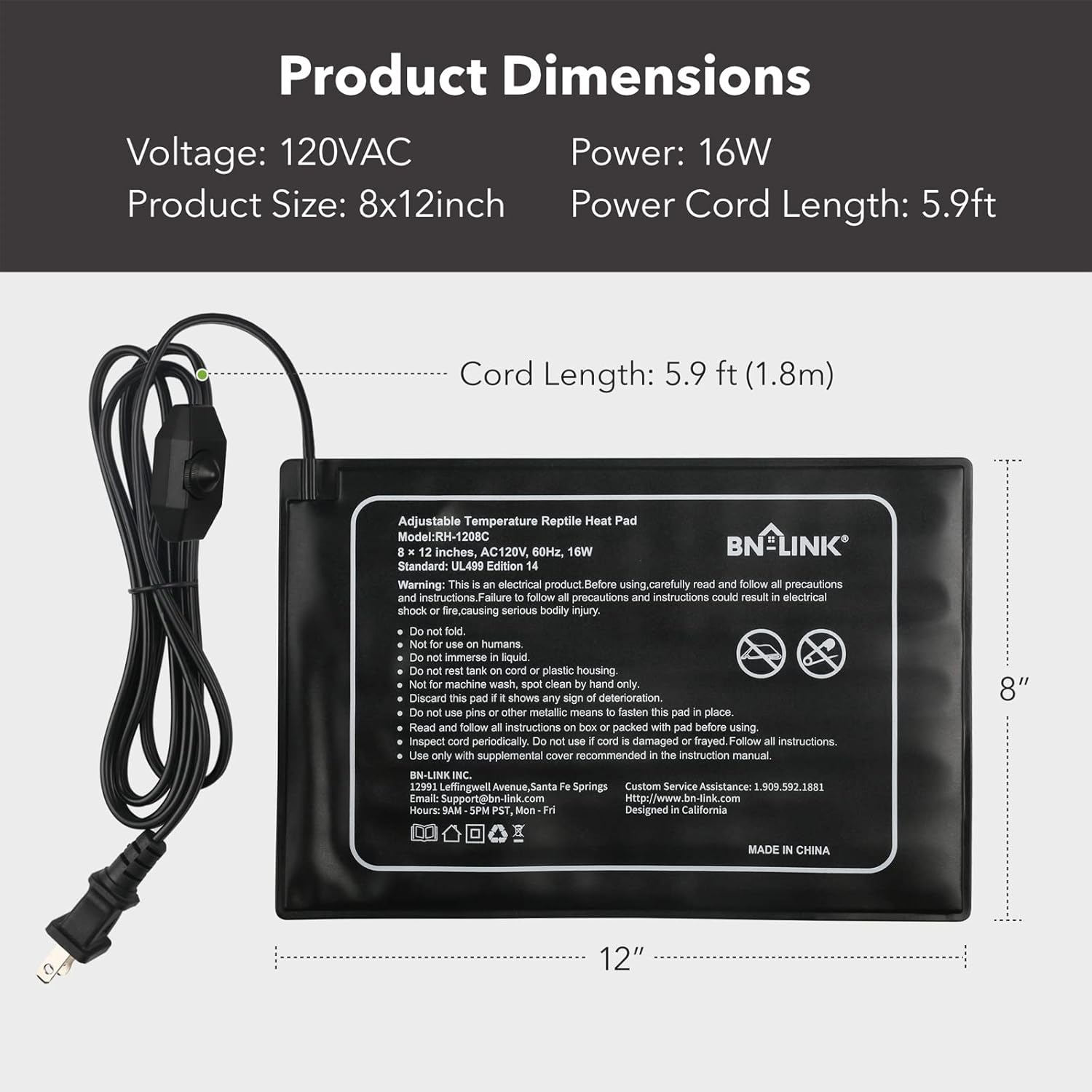 - MADE FOR REPTILES: Voltage: 120 volt, Power: 16 watt. The 8" x 12" model is perfect for a 10 -20 gallon terrarium and it can easily put out steady heat between 104℉ and 122℉. Each unit comes with BN-LINK’s strong 15-month warranty.