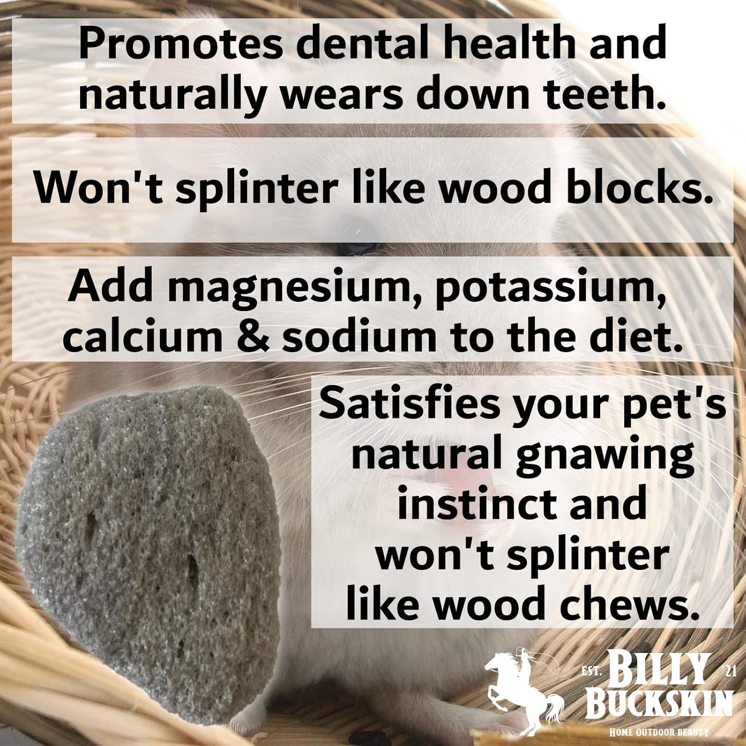 - NATURAL CHEW TREATS WITH NUTRIENTIONAL BENEFITS - Billy Buckskin Pumice Rabbit Treats are more than just engaging chew toys—they naturally support dental health and offer trace mineral benefits for rabbits, guinea pigs, hamsters, chinchillas, and other small pets. Ideal for daily cage enrichment, these nutrient-rich pumice stones help wear down teeth safely while promoting activity and overall well-being.