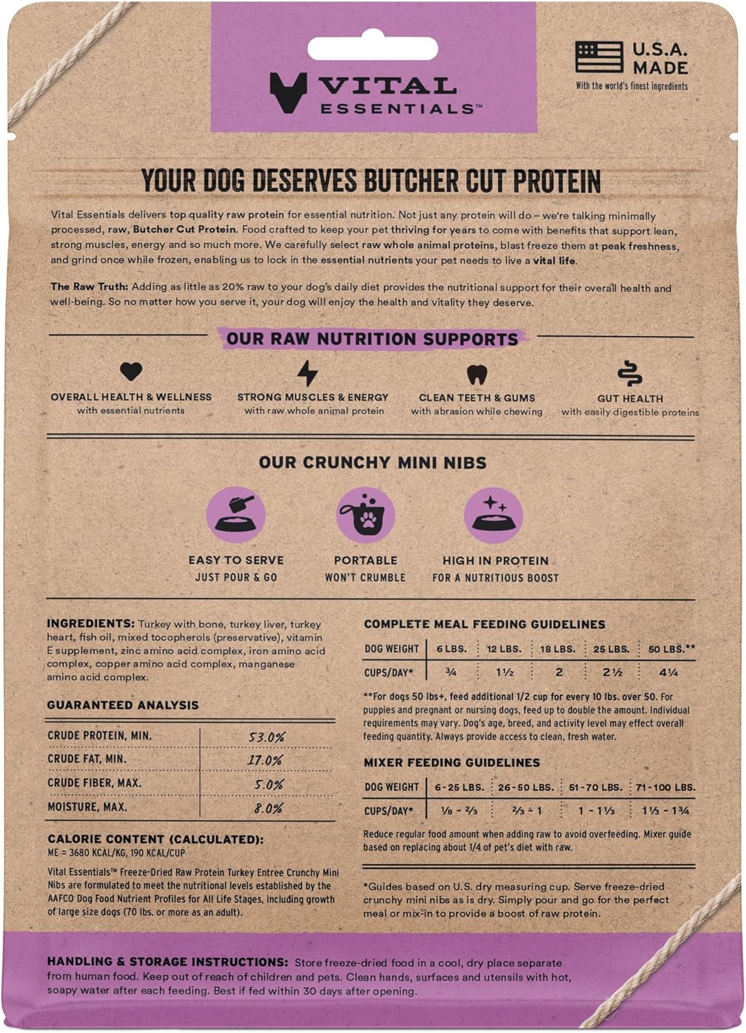 - CRUNCHY FREEZE-DRIED RAW TURKEY DOG FOOD: Vital Essentials Crunchy Freeze Dried Dog Food packs more protein than industry standard into every bite to deliver the peak vitality your dog deserves, especially when compared to dehydrated dog food. This complete and balanced freeze-dried raw dog food is made with premium butcher cut turkey, responsibly sourced in the USA.