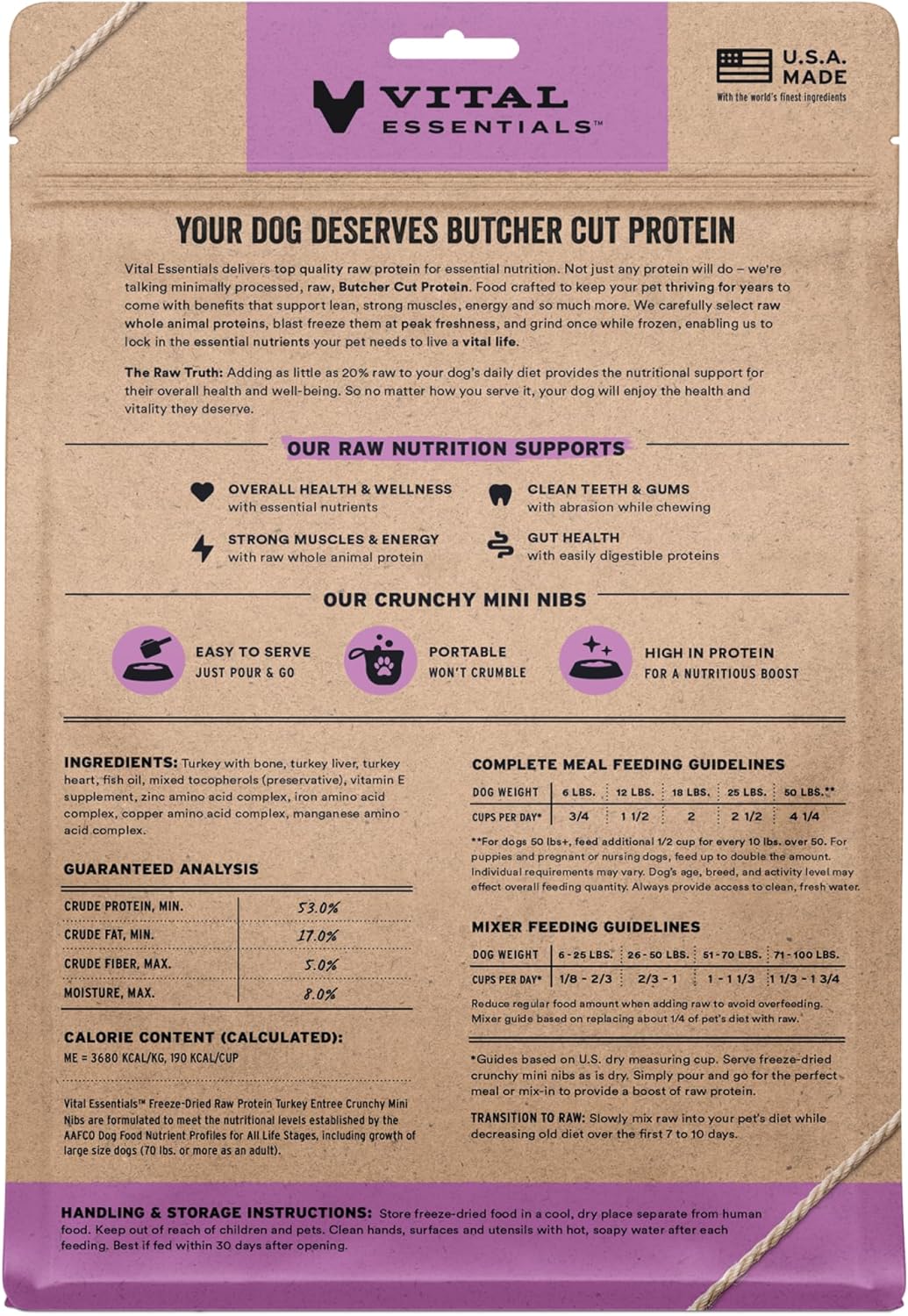 - CRUNCHY FREEZE-DRIED RAW TURKEY DOG FOOD: Vital Essentials Crunchy Freeze Dried Dog Food packs more protein than industry standard into every bite to deliver the peak vitality your dog deserves, especially when compared to dehydrated dog food. This complete and balanced freeze-dried raw dog food is made with premium butcher cut turkey, responsibly sourced in the USA.