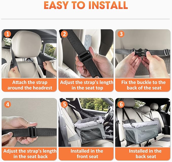 - 🐶[Easy to Install]: With its adjustable buckle design, the car seat for dogs can be easily installed. Simply attach the two straps around the headrest, fix the buckle to the back of the seat, and adjust the strap length as needed. It can be installed in both the front and back seats of your car, and it is compatible with most types of car seats and car models.