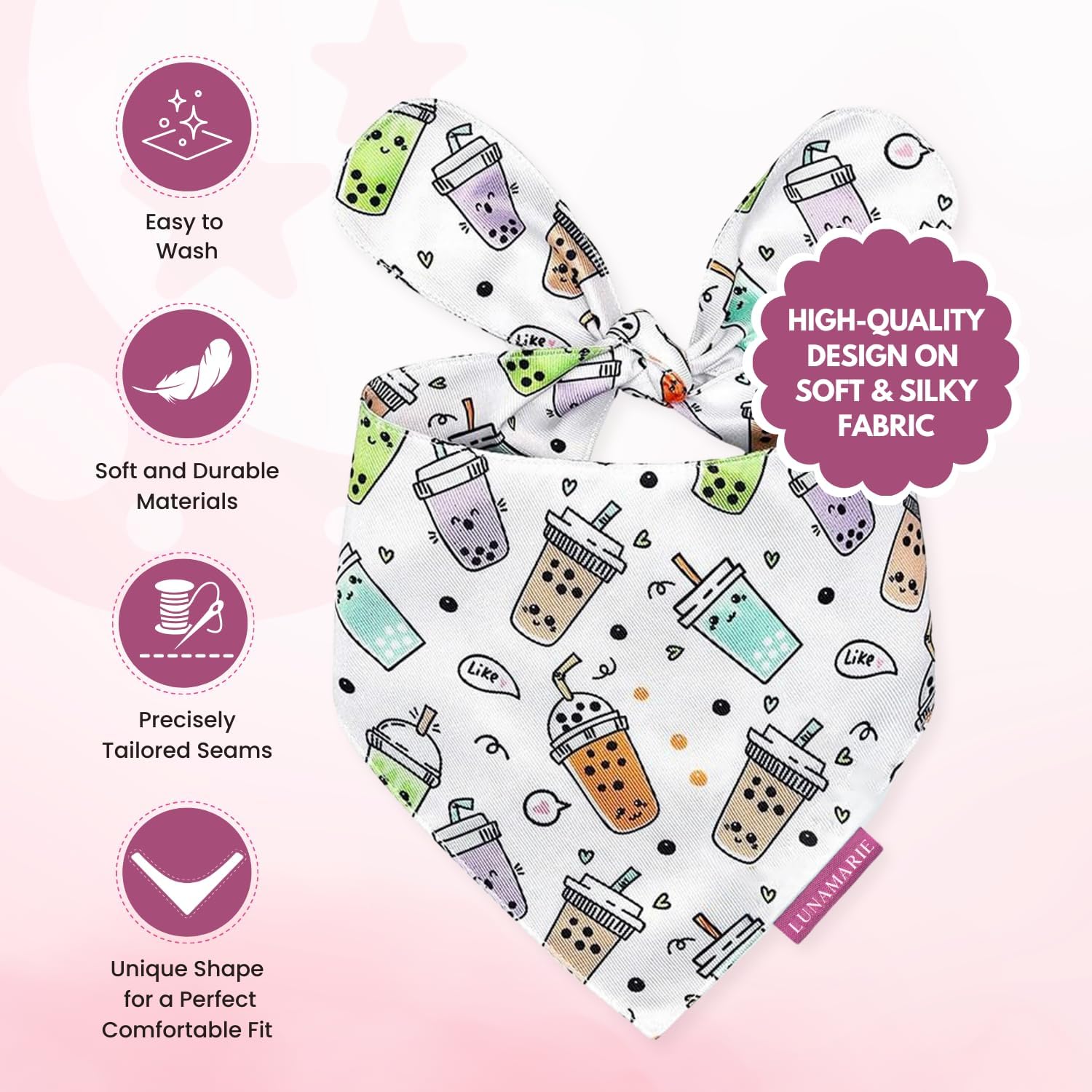 LunaMarie - Luxury Pet Birthday Bandanas -Premium & Silky Poly Fabric | 100% Handmade | Custom Shape Dual Layered (Boba, Medium)