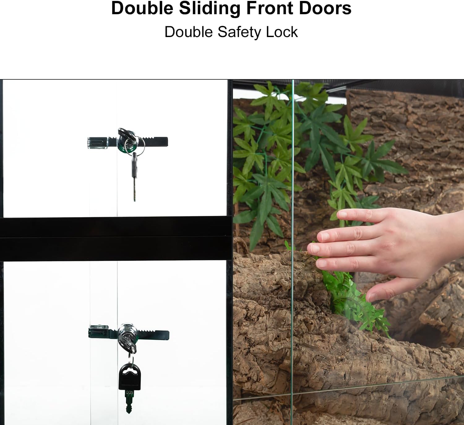 - 【Double Front Sliding Door】Adopt new patent design to be top grade small animal and reptile terrarium. In order to manage the tall reptile tank more conveniently, this bearded dragon terrarium has two upper and lower sliding doors. It's easy to clean the tank or add decoration. Safety lock prevents unwanted opening from children or pets.