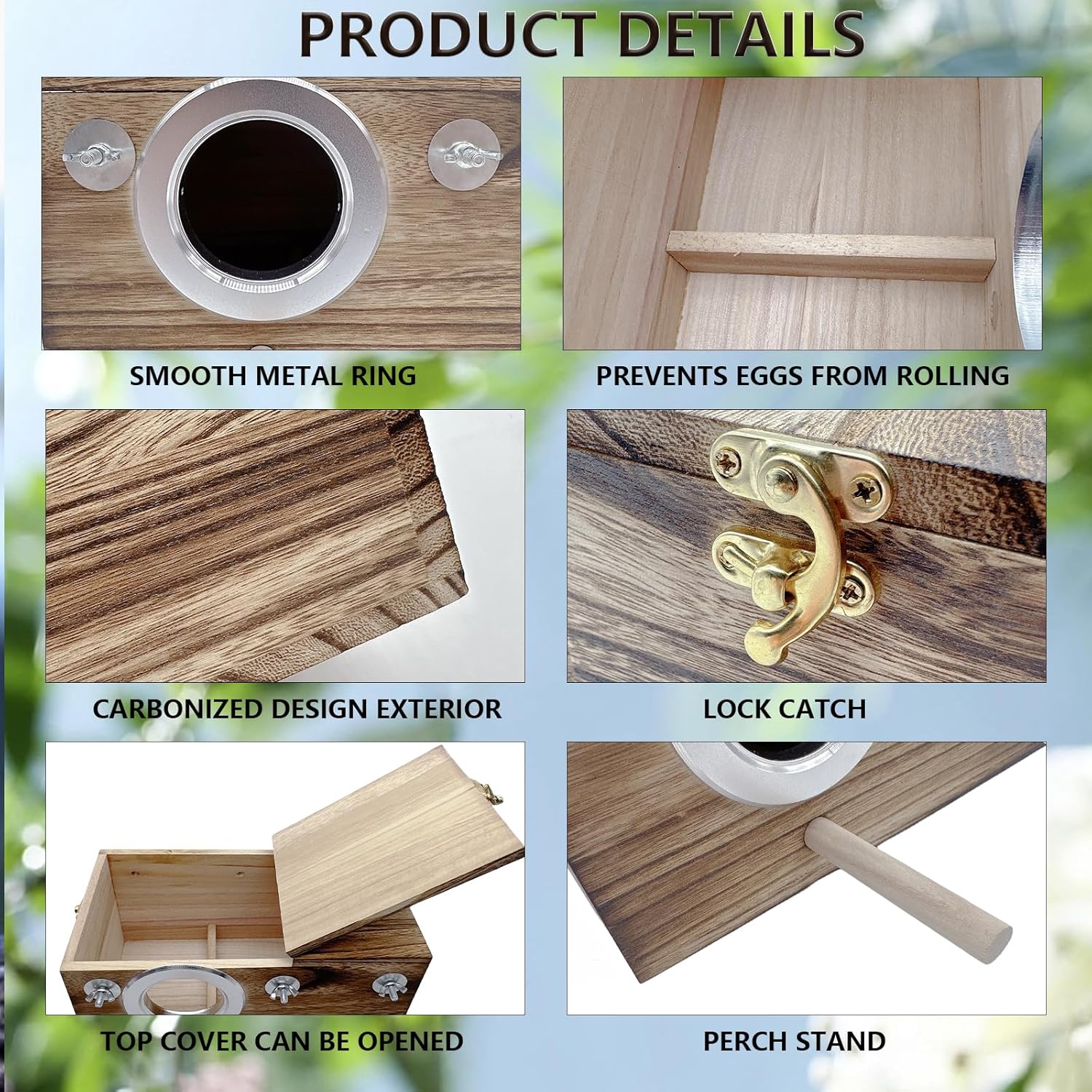 - 【Carbonized Appearance】 Our parrot breeding box is made of natural solid wood, safe, non-toxic, sturdy, and durable, providing a bird-friendly environment. The surface of the bird's nest is carbonized, enhancing the natural texture and creating a primitive effect, allowing pet birds to feel a sense of returning to nature.