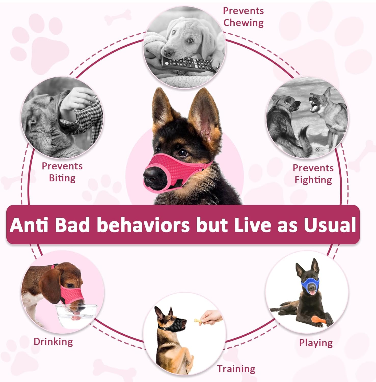 - Effective Behavior Management: Whether it's biting, chewing, nipping, or aggression, this no bite muzzle for dogs helps in redirecting and controlling these behaviors. This dog muzzle for biting allows you to create a safer and more harmonious environment. Please note that the muzzle is a tool that provides restraint but won't eliminate bad habits. Changing your dog's bad behavior requires patience, positive guidance, and lasting training