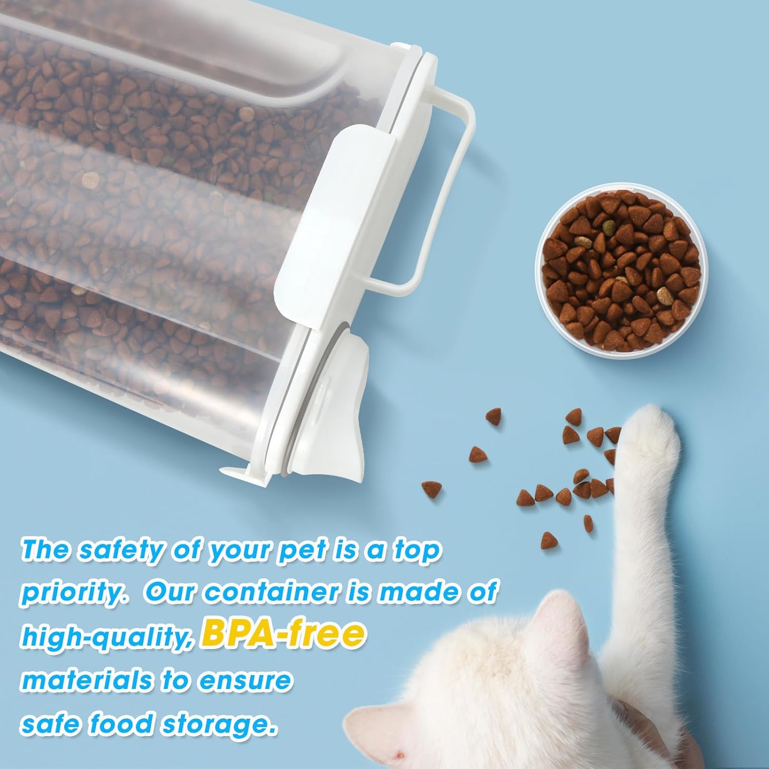 - Portable Pet Food Dispenser: Designed with an ergonomic carry handle and grip groove, this pet food stroage container is easy to hold and pour – even for small hands. Perfect for pet lovers of all ages, whether feeding indoors or outdoors