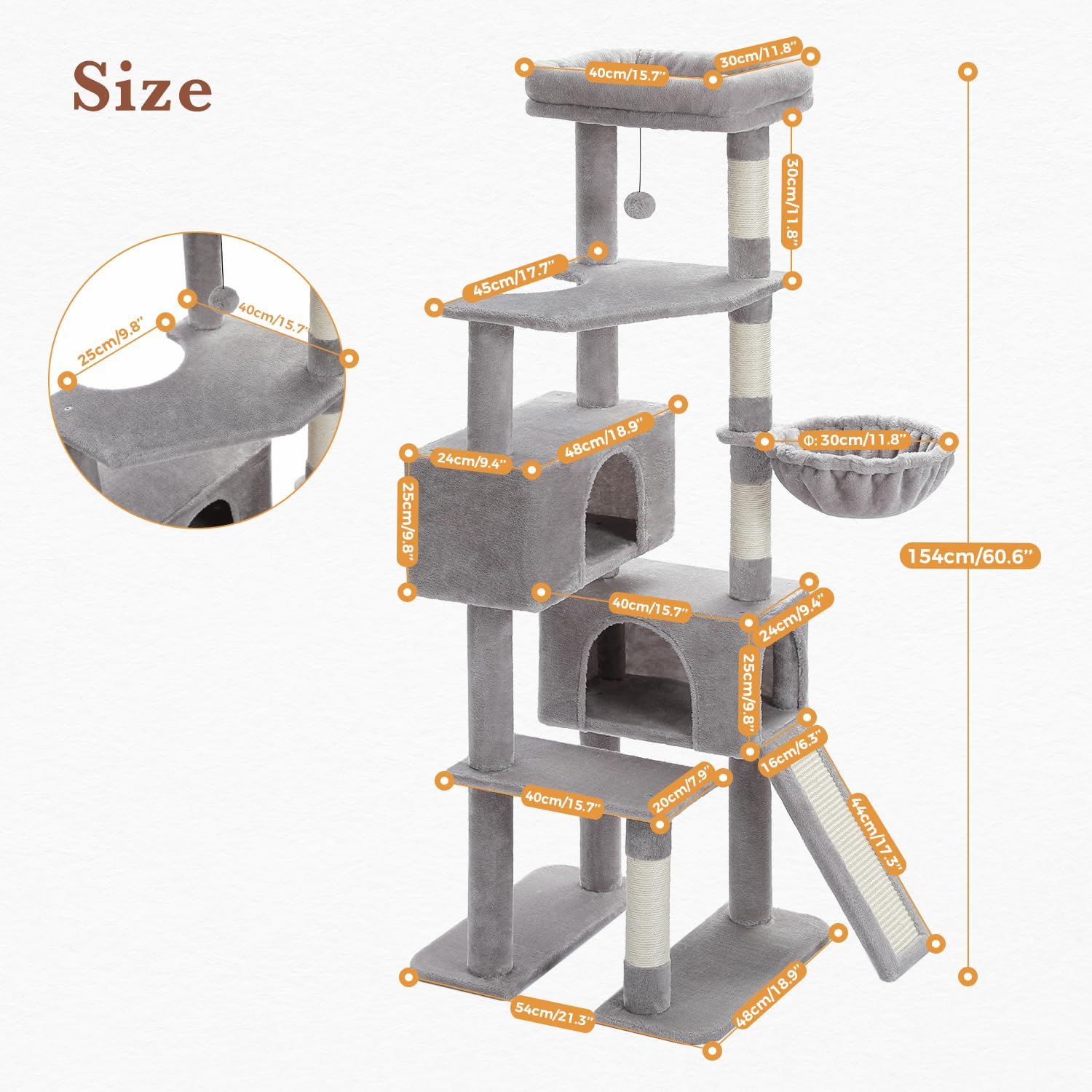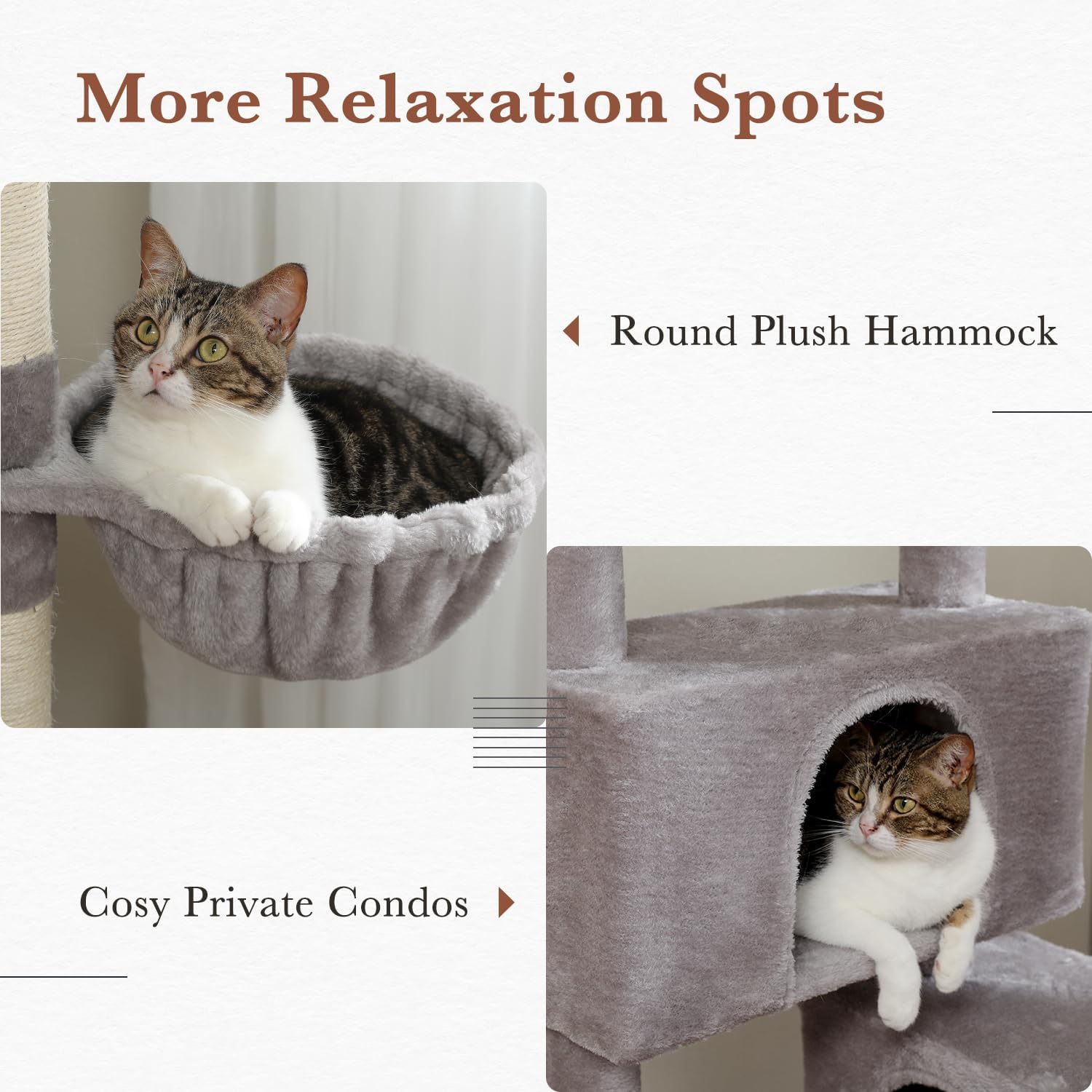 - Cozy and Privacy: The 6-level cat tower has two roomly condos measuring 18.89"X9.44"X9.84" and 15.74"X9.44"X9.84" whose enclosed design creating a sense of security and provide cats quiet places to curl up. The large perch measures 15.74"X11.81" and the basket is 11.8” in diameter. The two both featured with comfy and super soft plush offering a skin-friendly experience for your cute cats sleeping.