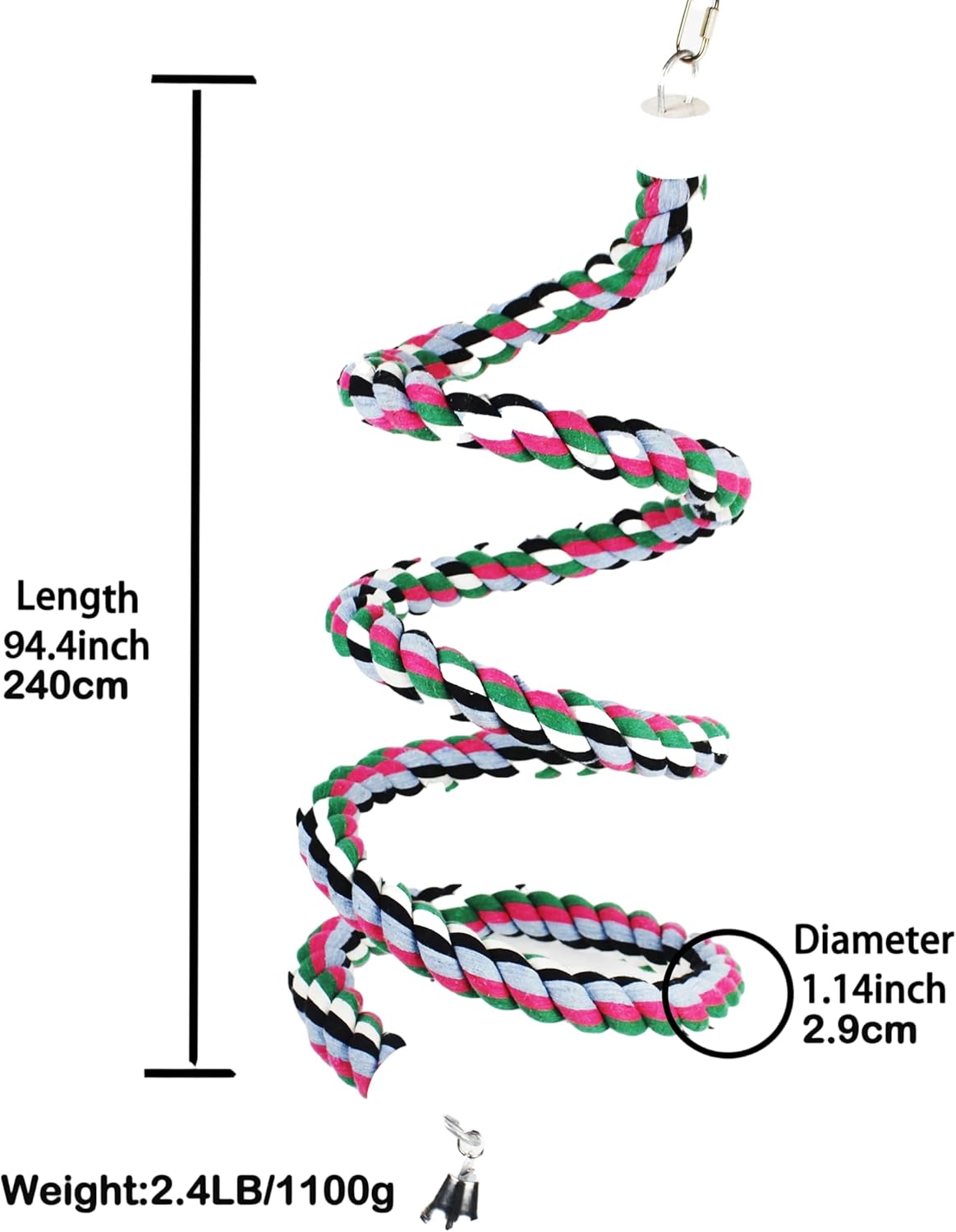 - 🐦[WHAT YOU GET] 1pc 94.4inch length soft cotton spiral rope with metal bell,fully closed/open hook can hang in birdcage or outside safety,bendable internal steel wire can re-sharp it provide more fun for your pets