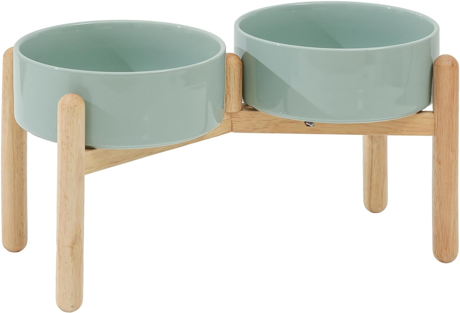 Ceramic 8.2inch Raised Dog Bowl with Stand for Large- Breed Dogs, Pet Food and Water Feeder (Double Bowl with Stand - Light Green)
