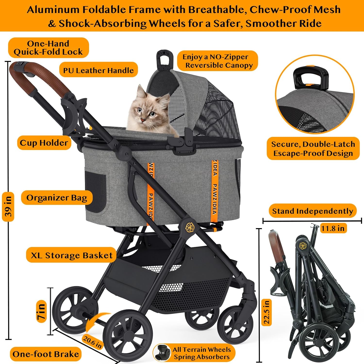 - Quick Assembly, One‑Handed Fold & Enhanced Portability: Built with a lightweight (only 10 lb) aluminum frame, the one‑hand quick‑fold design ensures effortless storage and transportation. The independent standing design (with a PU leather-free handle) and one-foot brake offer added convenience, while an integrated cup holder and extra‑large storage basket keep pet supplies and toys within reach.