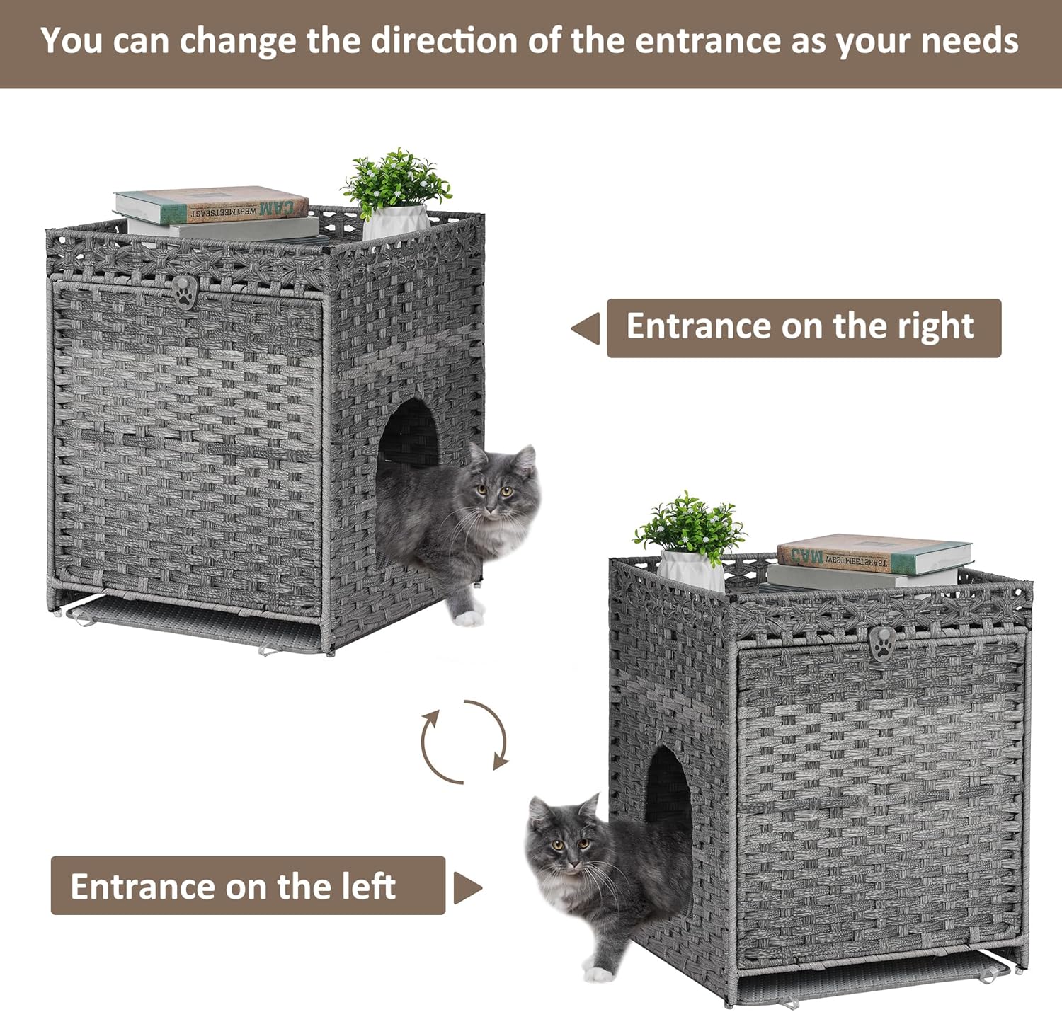 - 【More sunshine, Less odor】 The cat litter box enclosure offers a private place where cats feel safe to answer nature’s call. The rattan cat litter box enclosure can transmit light, allowing cats to enjoy the sunshine while blocking odor emission.