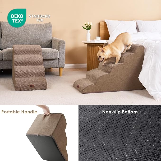 - SPECIFIC AND STEADY DESIGN - 33D density of pure foam make this stair more steady when your pets walk on. The dog bed stairs can provide strong support for pets in the walking process. Low angle slope design can better protect your pet's joints.