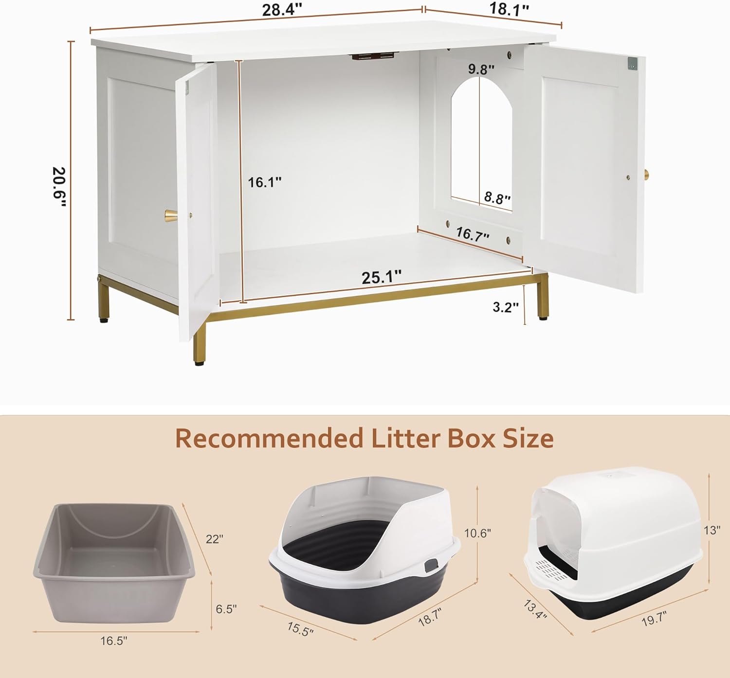 - Modern style: The cat litter box cabinet features white finish and metallic gold-colored metal frame, adding an elegant and stylish touch to your home decor. Its minimalist design and exquisite detailing inject a touch of luxury and sophistication into your living space