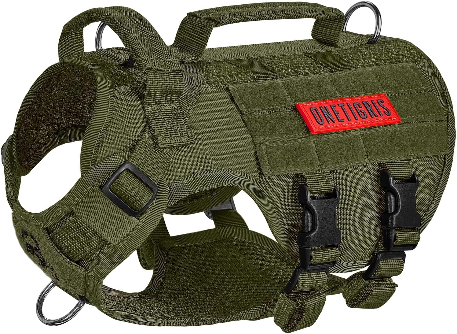 - [Molle/Handles]: Looped MOLLE panel on both sides for MOLLE compatible add-ons such as treat totes, poop bag pouches, service dog kits, military patches and name tags. 2 padded grab handles with reinforced stitchin. Useful for getting in/out of a car, immediate canine control in crowded areas or with other dogs, etc.