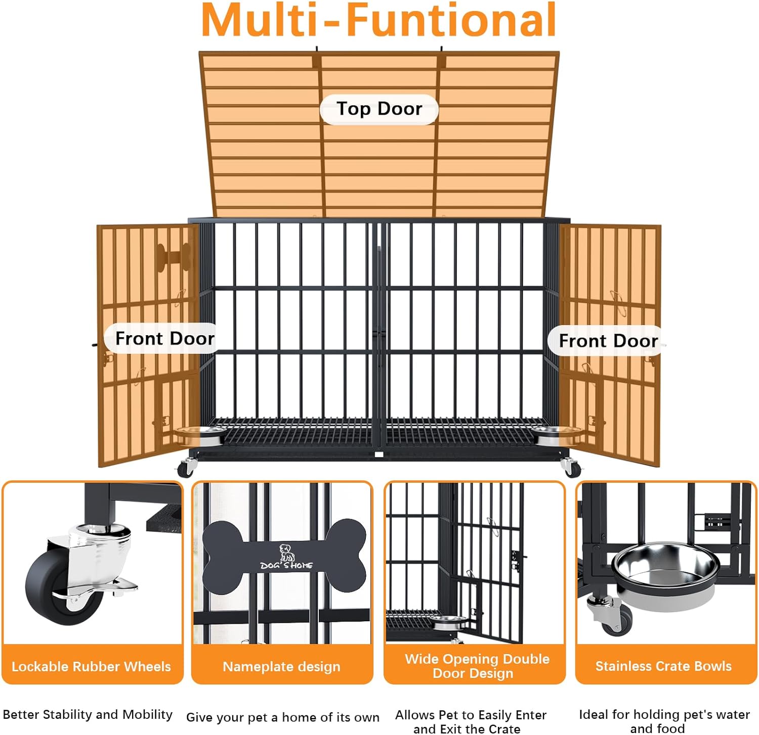 - 【Easy Access & Feeding】The dog crate has double doors and a reversible top for easy access almost anywhere. Installation usually takes only 10 minutes, including detailed instructions and installation parts.The kennel is additionally designed with 2 small feeding doors with locks.These doors allow quick and easy access to the stainless steel dog bowl, swing bowl, without having to open the front door for easy feeding. The dog kennel double door design is not only easy to get in and out of the kennel, but also good for you to interact with and feed your dog.This crate has multiple ways to open the door, so you can experiment with agility and obedience, allowing them to grow faster.