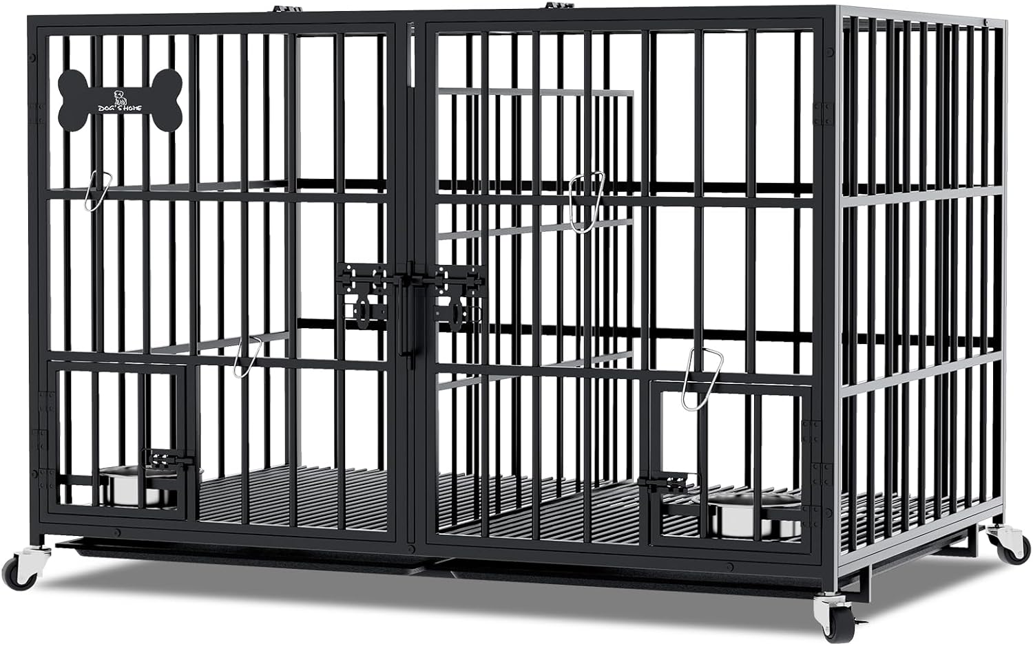 - 【Practical & Easy to Move and Clean】The dog crate comes with four smooth rolling locking wheels for easy movement and fixation, you can easily move the crate to different positions as needed. The dog crate comes with two pull-out tray for easy removal and cleaning. It also comes with a safety latch to avoid your smart dog from opening the iron door, effectively protect your pet.