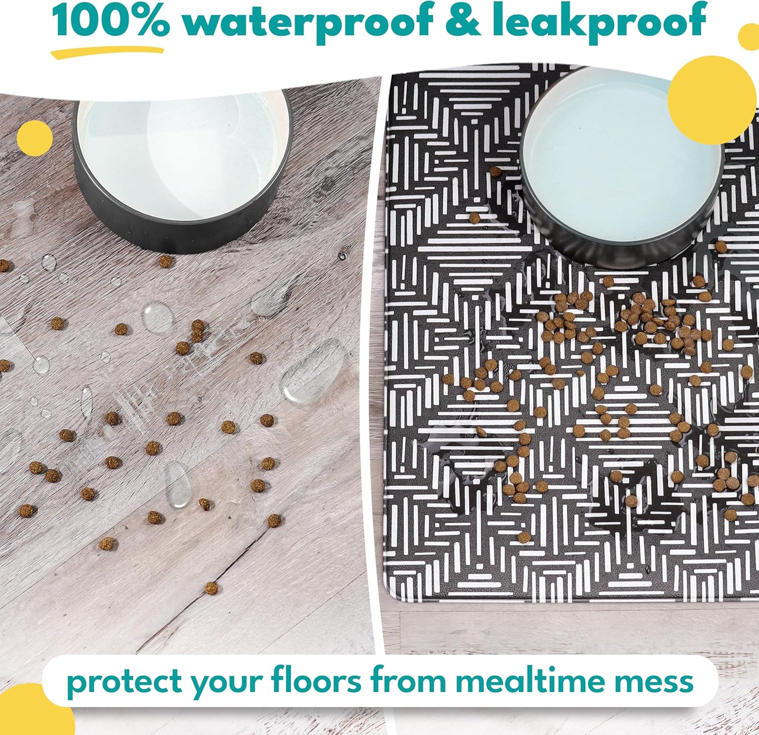 - MADE FOR PETS, DESIGNED FOR YOU – Our stylish dog food mat for bowls and water dishes blends seamlessly into your home décor. Unlike typical pet feeding mats, our non-slip, waterproof dog placemat features modern designs that fit your space, keeping floors clean while looking great.