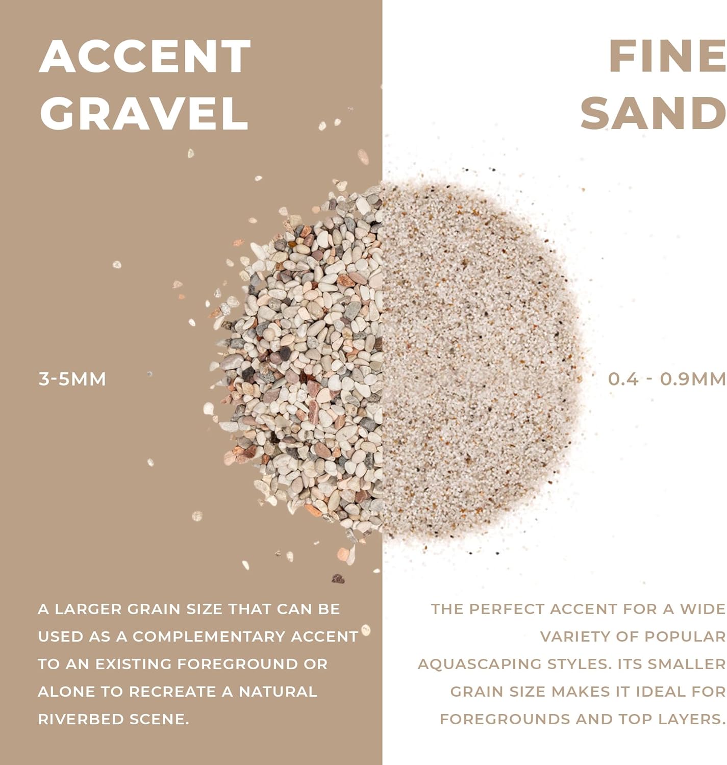 - [Fine-grained Substrate] Our fine-grained Mojave sand is a mixture of richer colors, producing a warmer tone. This fish tank substrate also works in blackwater aquariums, biotopes or planted tanks that feature Dragon Stone or aquarium driftwood.