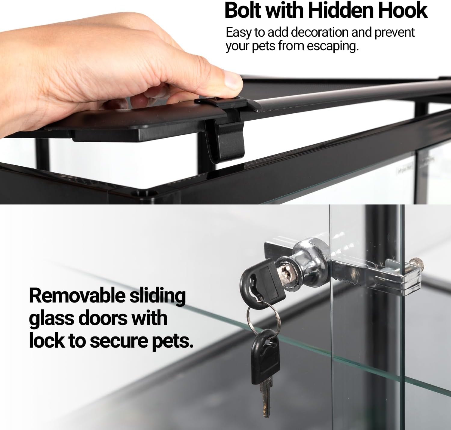- 【2 IN 1 Front Glasses Doors】Patented design 24" x 16" x 16" full glass terrarium with 4"&7" two different height front glasses, great for different needs. A flexible feeding cage for your reptile or small animal pets as hamster, guinea pig, gecko and bearded dragon.