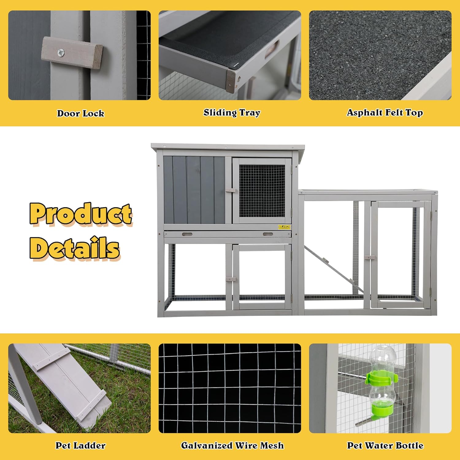 - [Easy to Clean]:The attic of rabbit hutch outdoor is equipped with a sliding tray contributing to provide a comfortable and sanitary environment. The smooth surface and high hardness plastic can be cleaned by rinsing with water only. An openable roof and two front doors for easily cleaning and feeding.