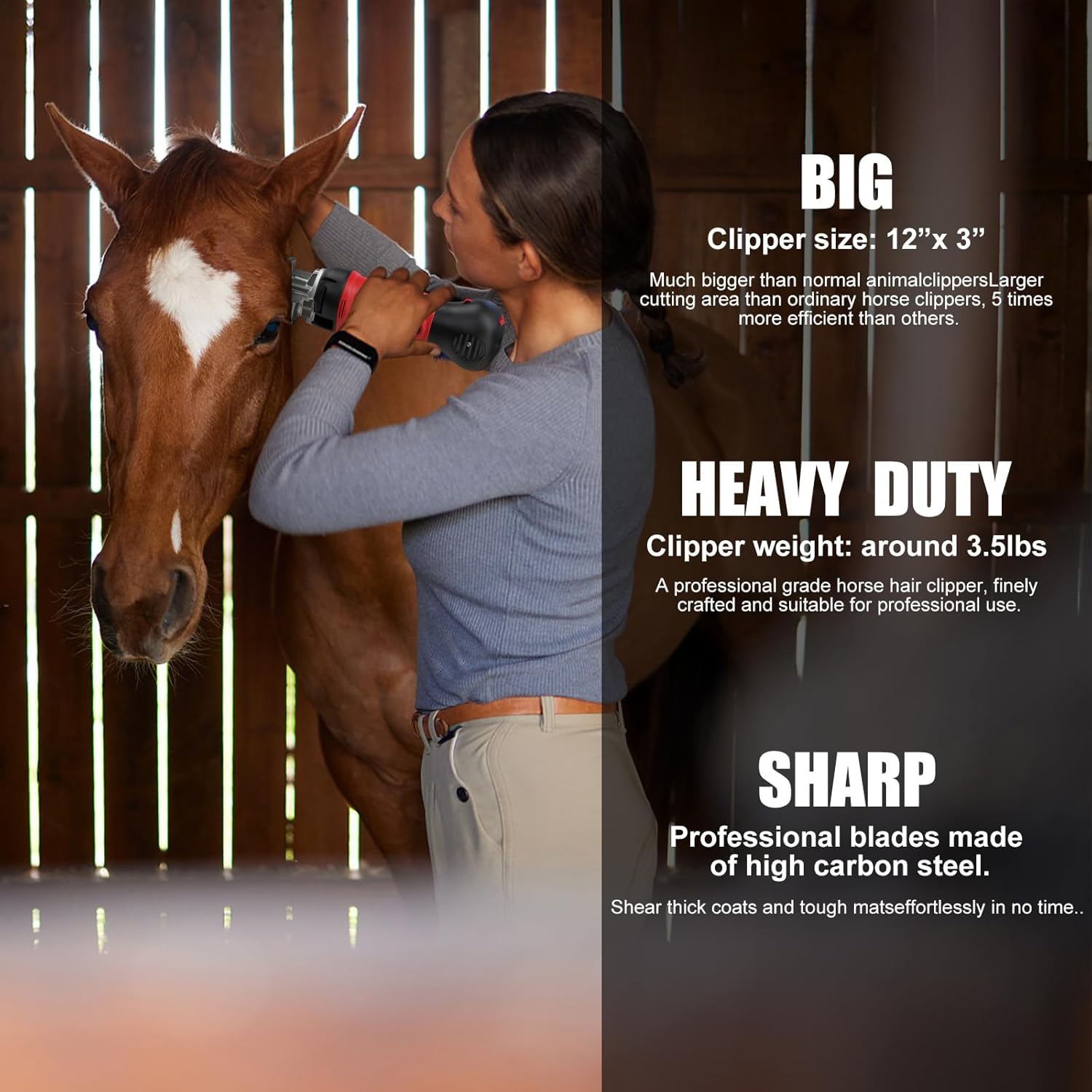 - 【Heavy Duty Horse Clippers】: Designed for trimming horses, goats, llamas, ponies, cows, and even thick-coated donkeys, these electric clippers offer exceptional versatility. With a user-friendly grip structure designed for prolonged use without fatigue, they ensure labor-saving efficiency for all your grooming needs.