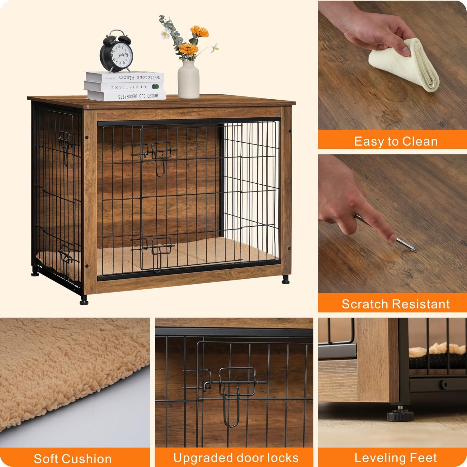 DWANTON Dog Crate Furniture with Cushion, Wooden Kennel Table with Double Doors, Indoor Dog House, Medium Size, 32.5" L, Warm Brown