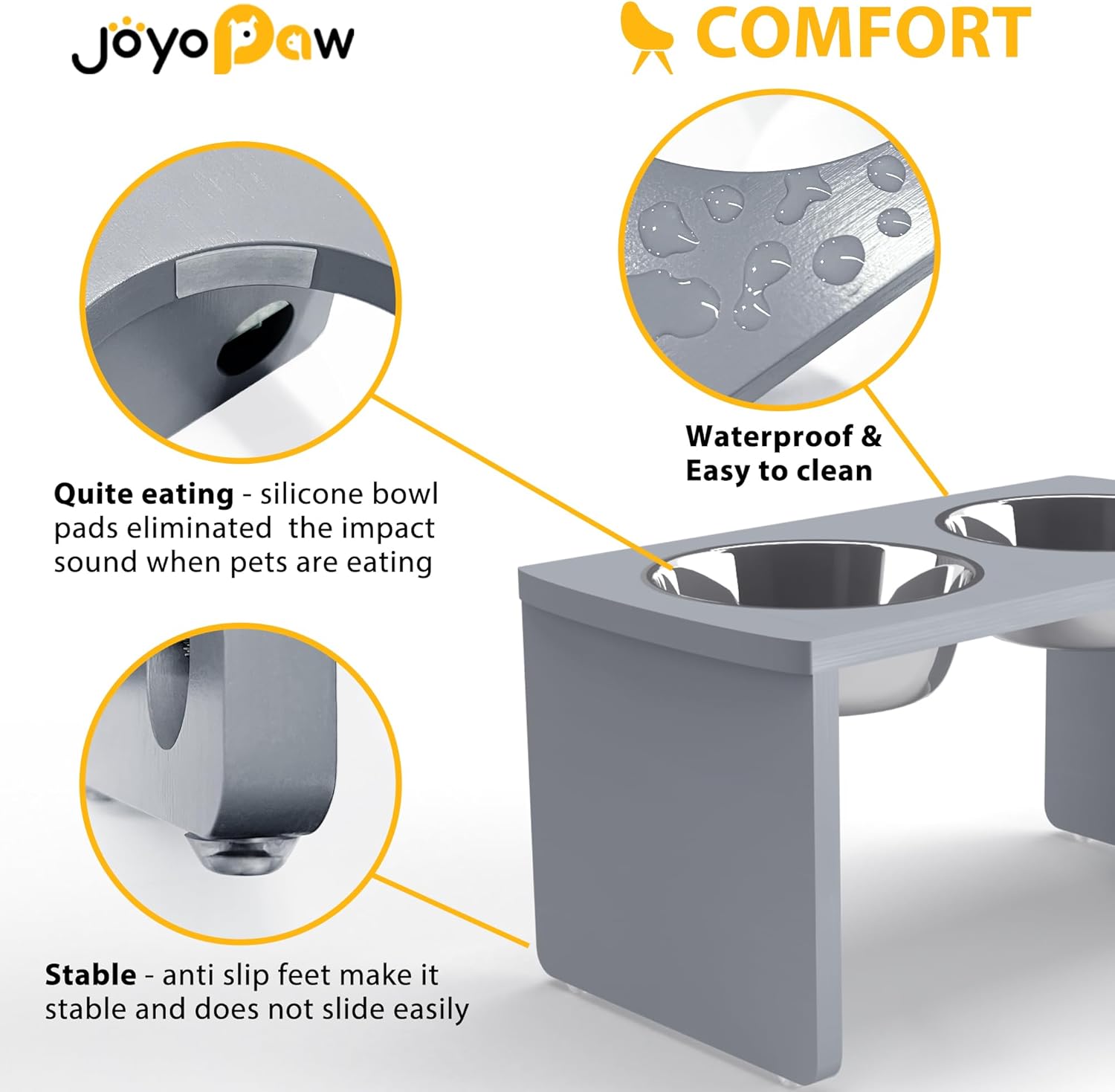 - IMPROVE HEALTH STATUS? JoyoPaw bamboo dog food stand provide ease of access to food and water which help to reduce bloating and neck strain in dogs. Encourage effective digestion and avoid joint pressure to protect your adorable friend.