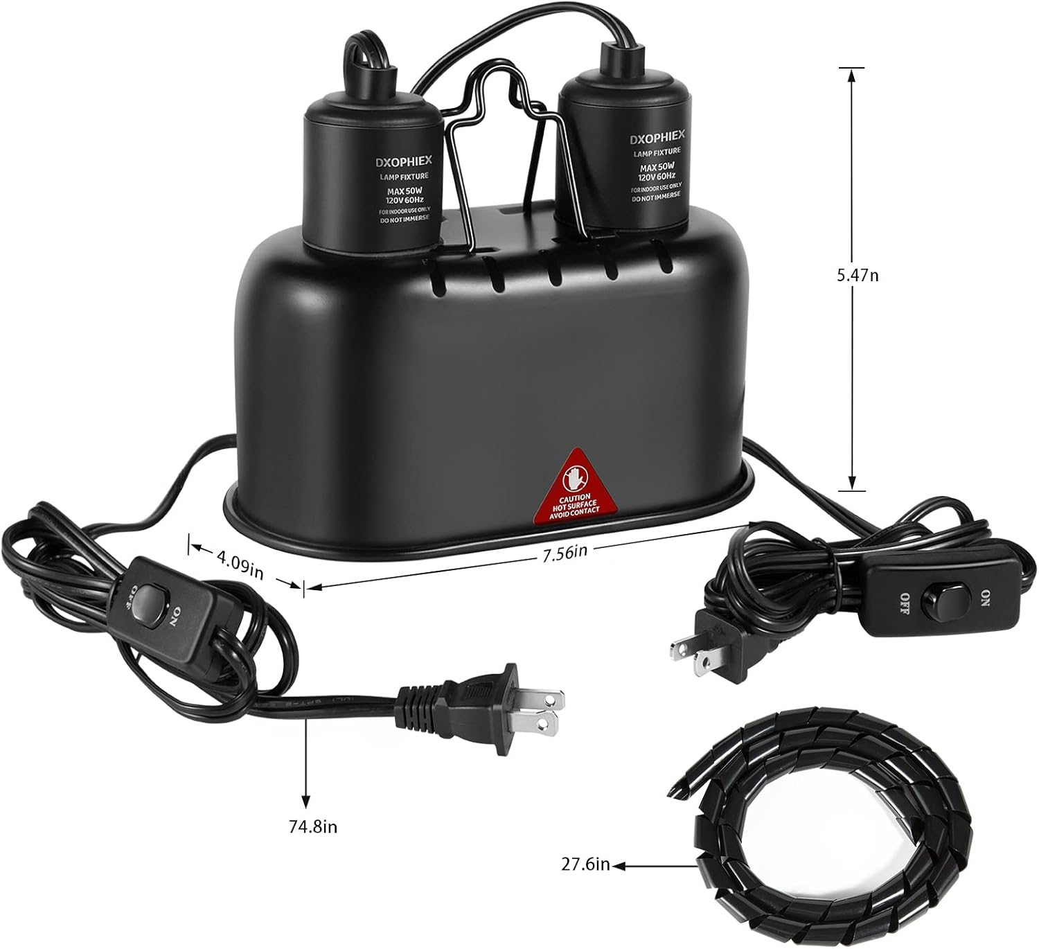 - 【Two Independent Switches】:The double dome reptile lamp is controlled by separate power lines to switch the two bulbs, so as to facilitate the management of temperature and light. You can adjust the appropriate and comfortable lighting environment for your pet at will.