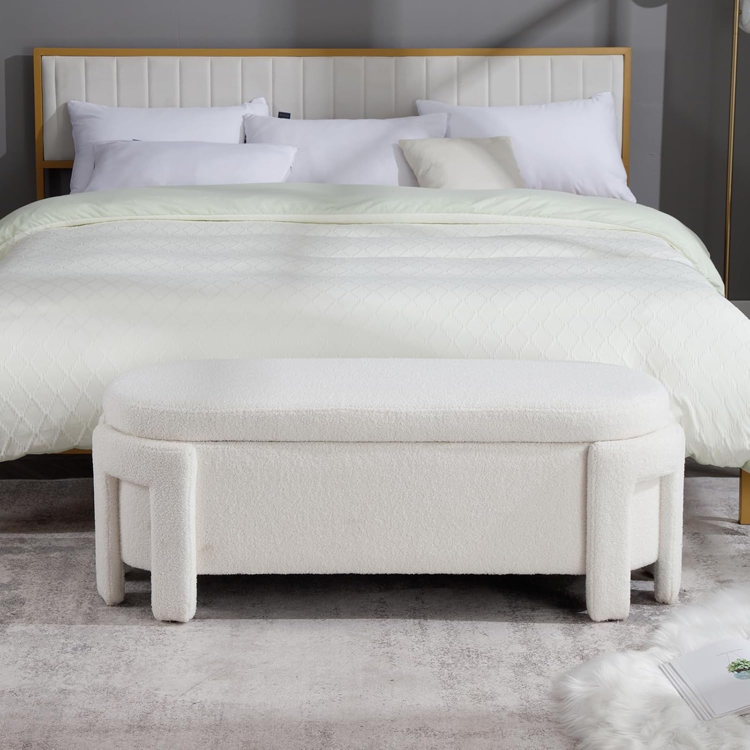 Modern Upholstered Storage Bench, Boucle Sherpa Fabric 50" Long Entryway Bench with Storage and Seating, Comfy Cute Ottoman Bench for Living Room/End of Bed/Hallway, White