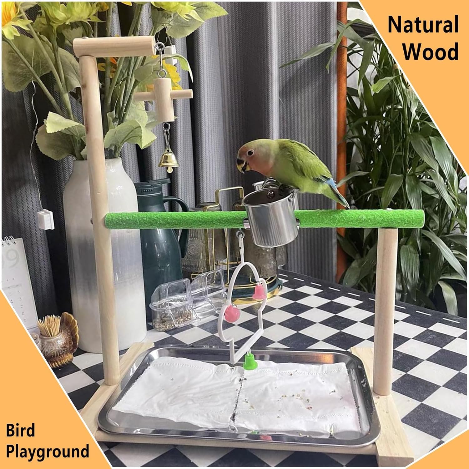 Bird Palyground, Parrot Playstand Natural Wood, Bird Perch Stand Gym with Feeder Cups and Removable Tray, Bird Cage Accessories for Parakeets Cockatiels Lovebirds