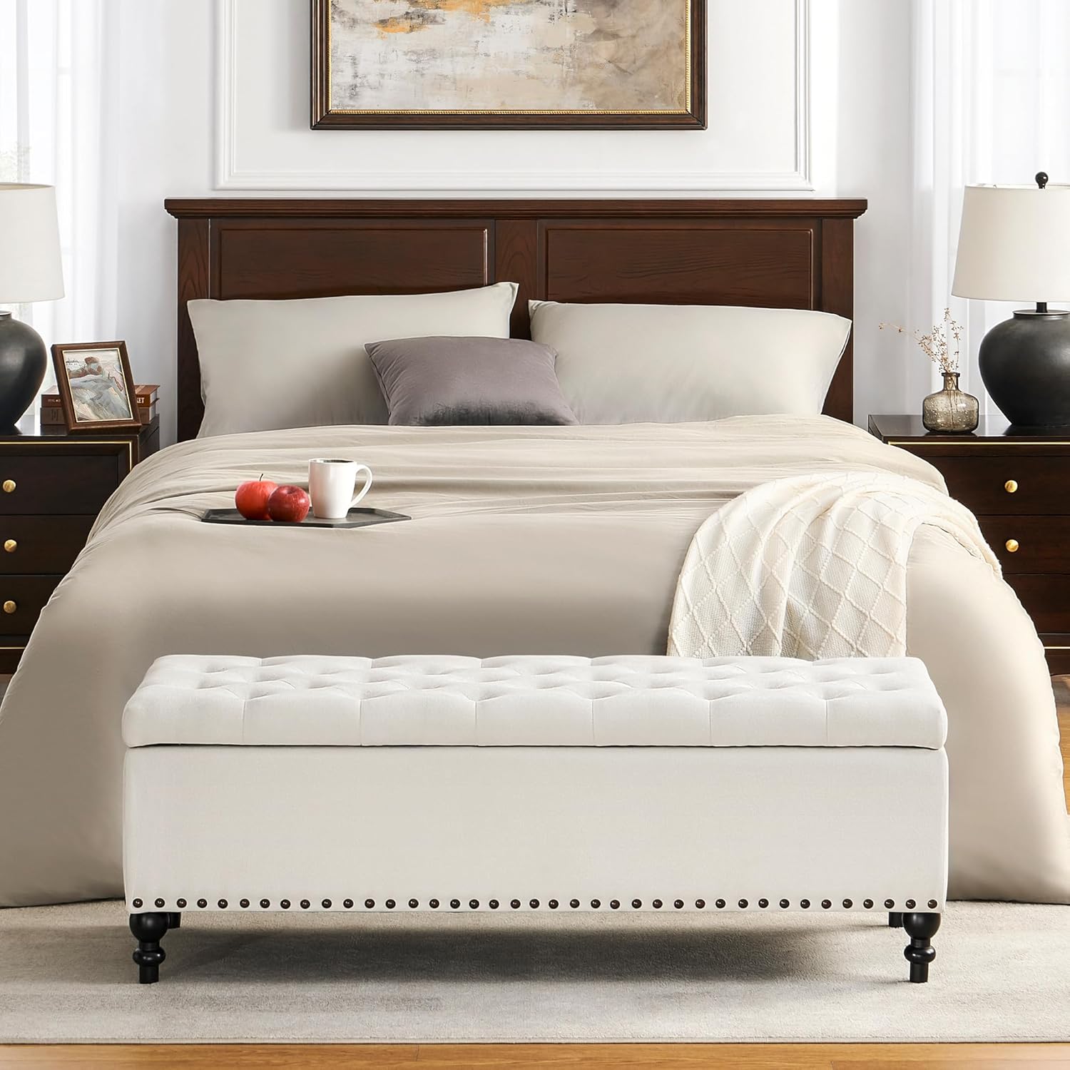 Ottoman with Storage,50.2-inch Upholstered End of Bed Storage Bench for Bedroom,for The Living Room,for Entryway, with Rivets & Button and Safety Hinges,Detachable (White)