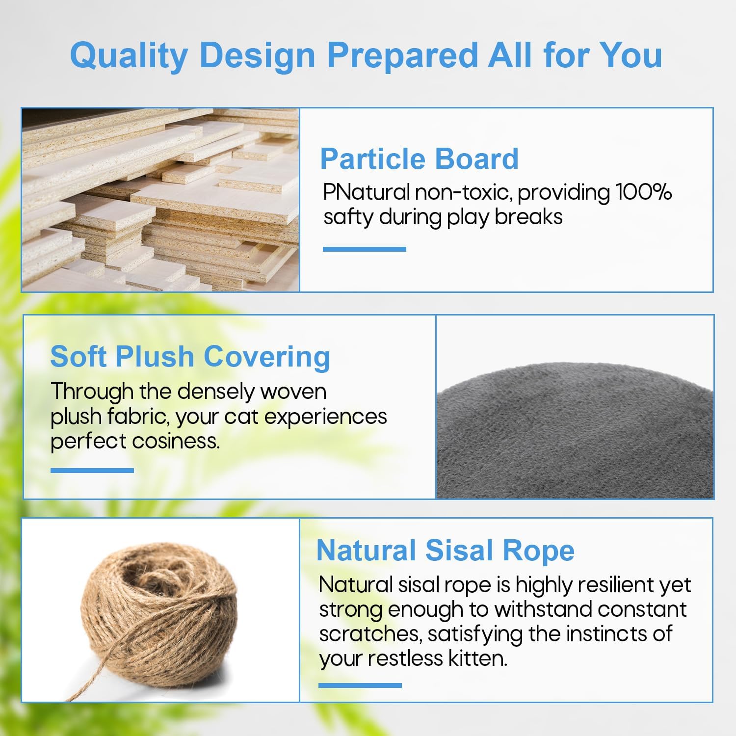 - 🐱 【Posts for Scratching Covered in Sisal 】These are scratching surfaces that are integrated into the framework. Cats love to bury their claws in sisal because it's a sturdy substance with a coarse texture. Our cat tree promotes healthy scratching habits and helps discourage cats from damaging furniture by offering dedicated spaces for them to scratch.
