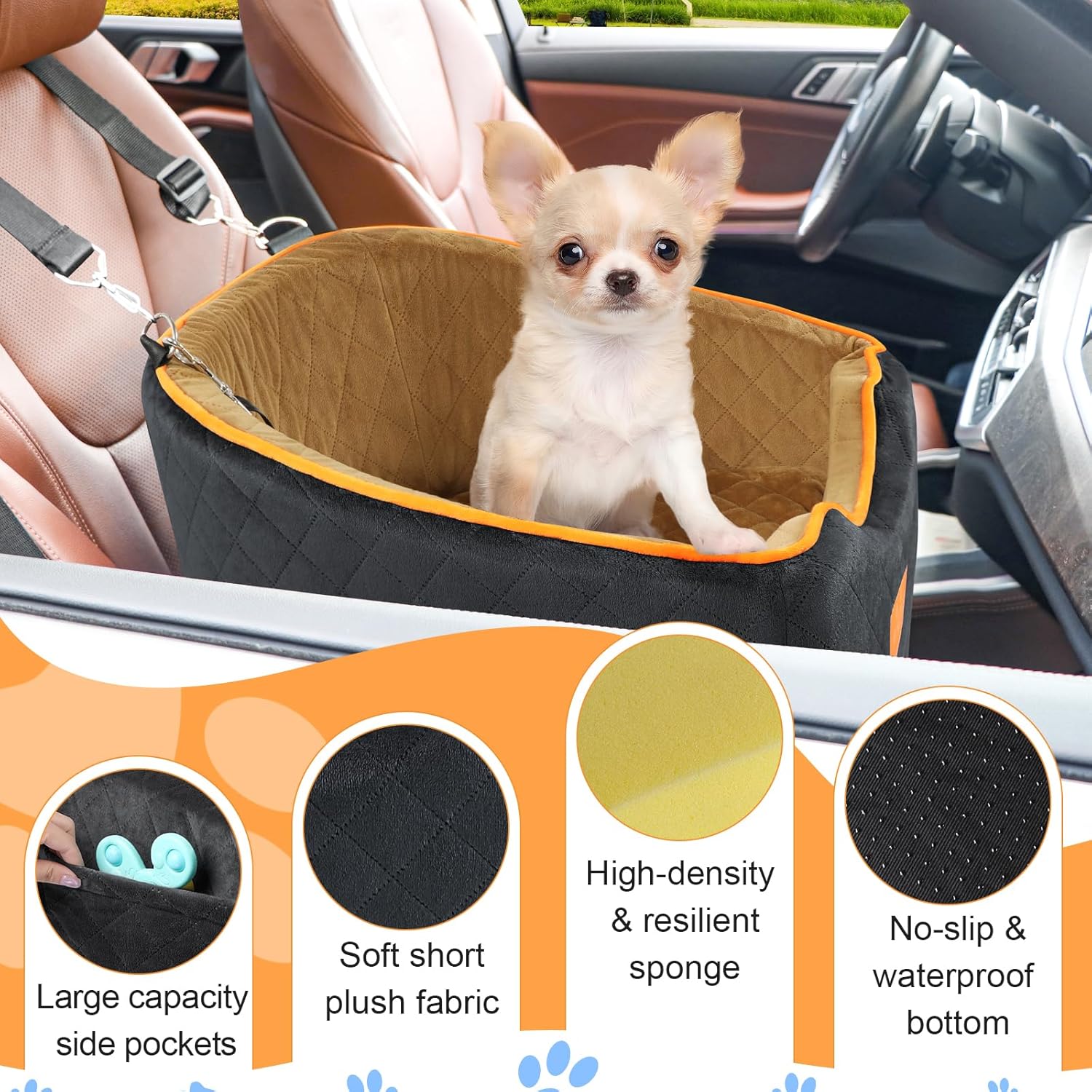 - Comfortable and Secure: The pet car seat is made of high-quality breathable fabric with a super soft plush rim, providing plenty of room for small dogs to readjust and get comfortable. The firm foam construction maintains its shape, offering a soft and cozy place for your dog to relax in extreme comfort. The non-slip bottom and safety tethers ensure that both your dog and the seat stay securely in place, preventing any sliding around while driving.