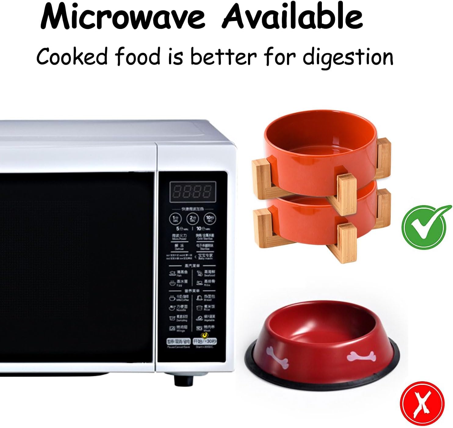 - EASY TO CLEAN CERAMIC - This easy clean dog bowl set is dishwasher proof, as well as easy to handwash and wipe down. With thick walls, these ceramic bowls for pets are sturdy, leak-free and weighty yet not too heavy. Double Bowl Design:One dog bowl for food and one for water, Each ceramic cat bowl has a Unique wooden stand, raising the dishes closer to your pet for more comfortable eating