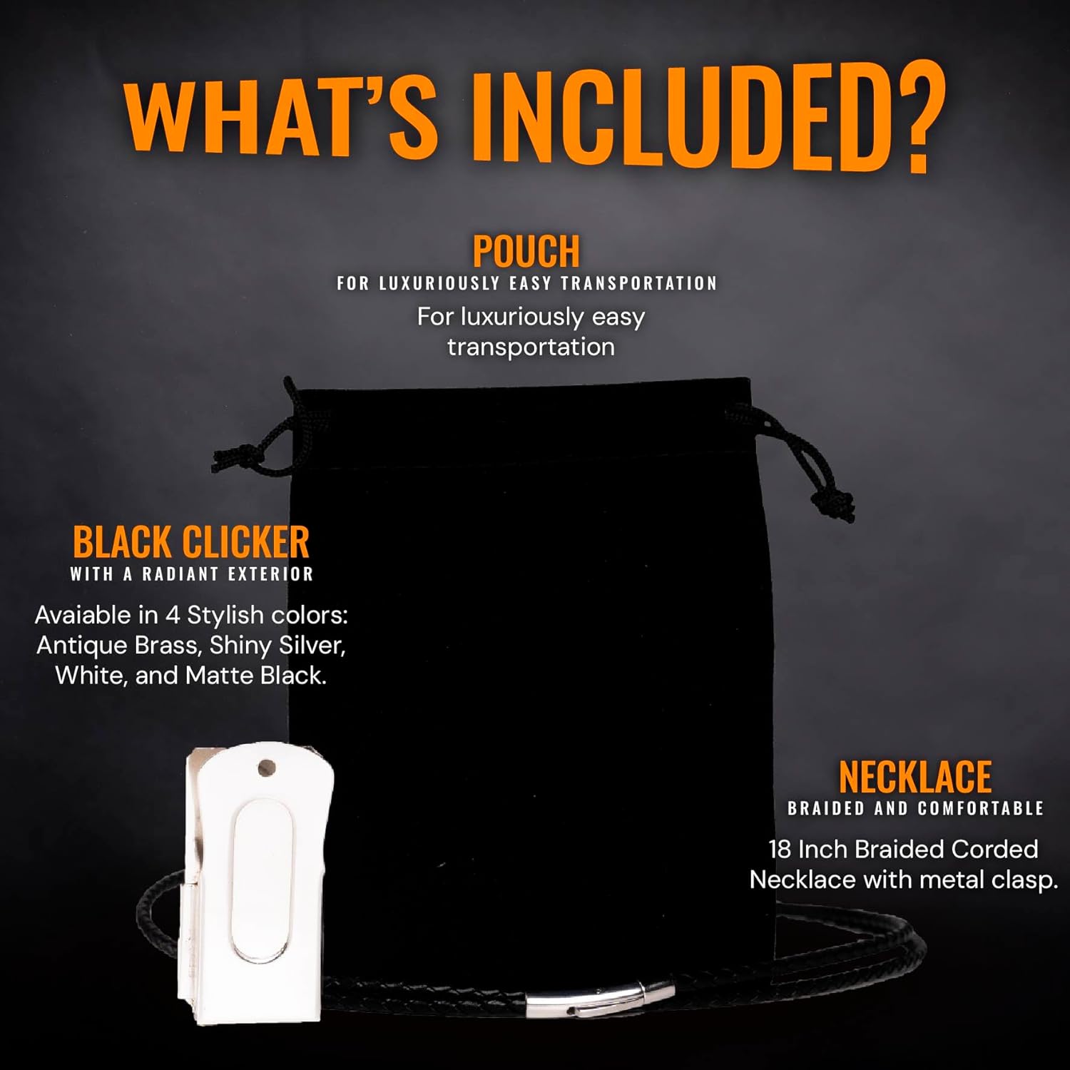 - Stand Out with Class: In a sea of ordinary clickers, our elegant White Puppy Training Clicker sets you apart. Embrace sophistication and style while improving your dog agility. Our dog accessories clicker product has a black exterior and also features a braided leather necklace with a magnetic metal clasp that matches your style perfectly