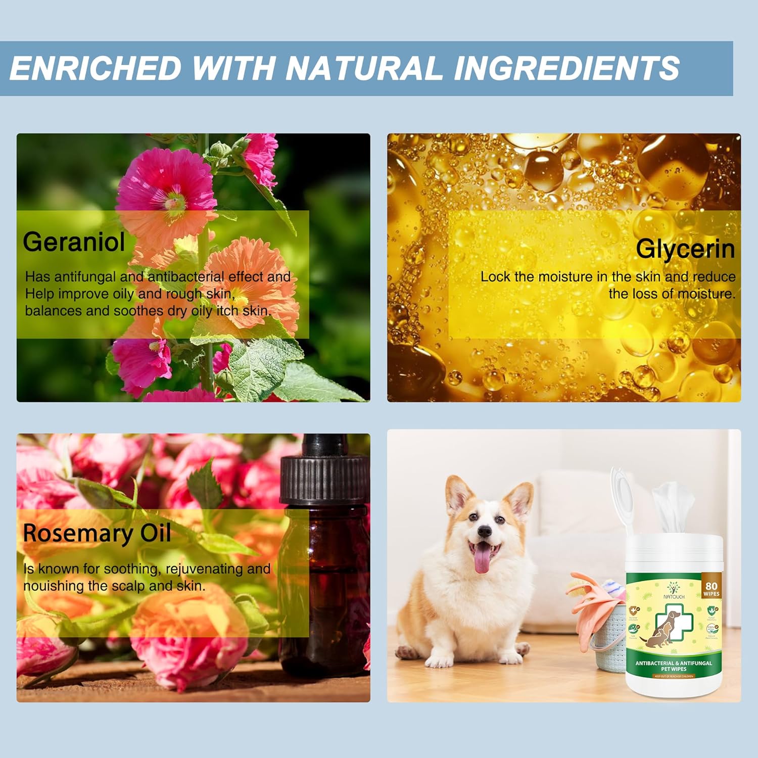 - NATURAL PET WIPES: The ingredients to have in wipes enriched with natural ingredients geraniol, glycerin, and rosemary oil. Geraniol has antifungal and antibacterial effect and Help improve oily and rough skin, balances and soothes dry oily itch skin. Rosemary oil is known for soothing, rejuvenating and nouishing the scalp and skin