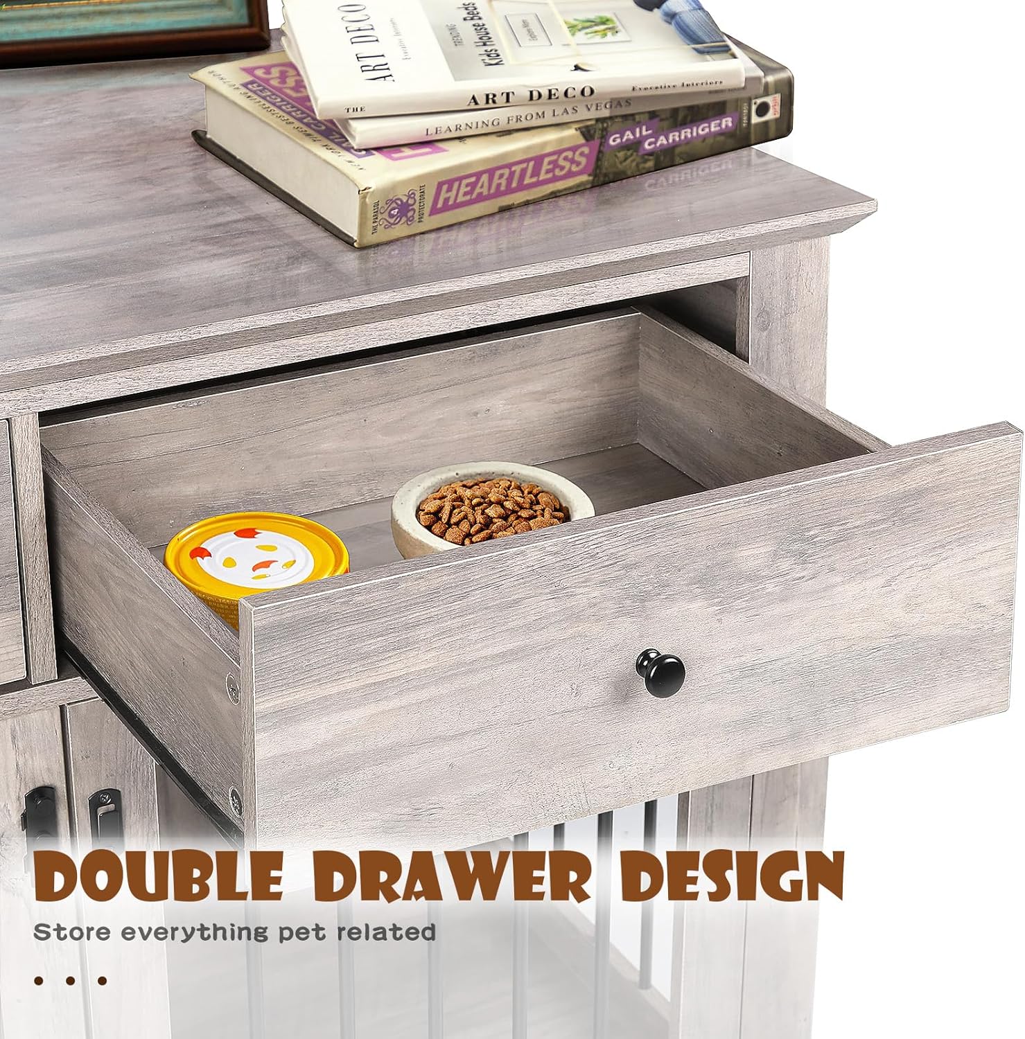 - Large Table Top & Storage Drawer: The top panel of the dog cage is large and sturdy, and can hold up to 150 lbs, perfect for displaying home decorations such as plants, magazines, and family photo frames. And below the countertop are two large drawers, you can store dog food, snacks, toys, etc. Under the drawers is the exclusive space for the dog