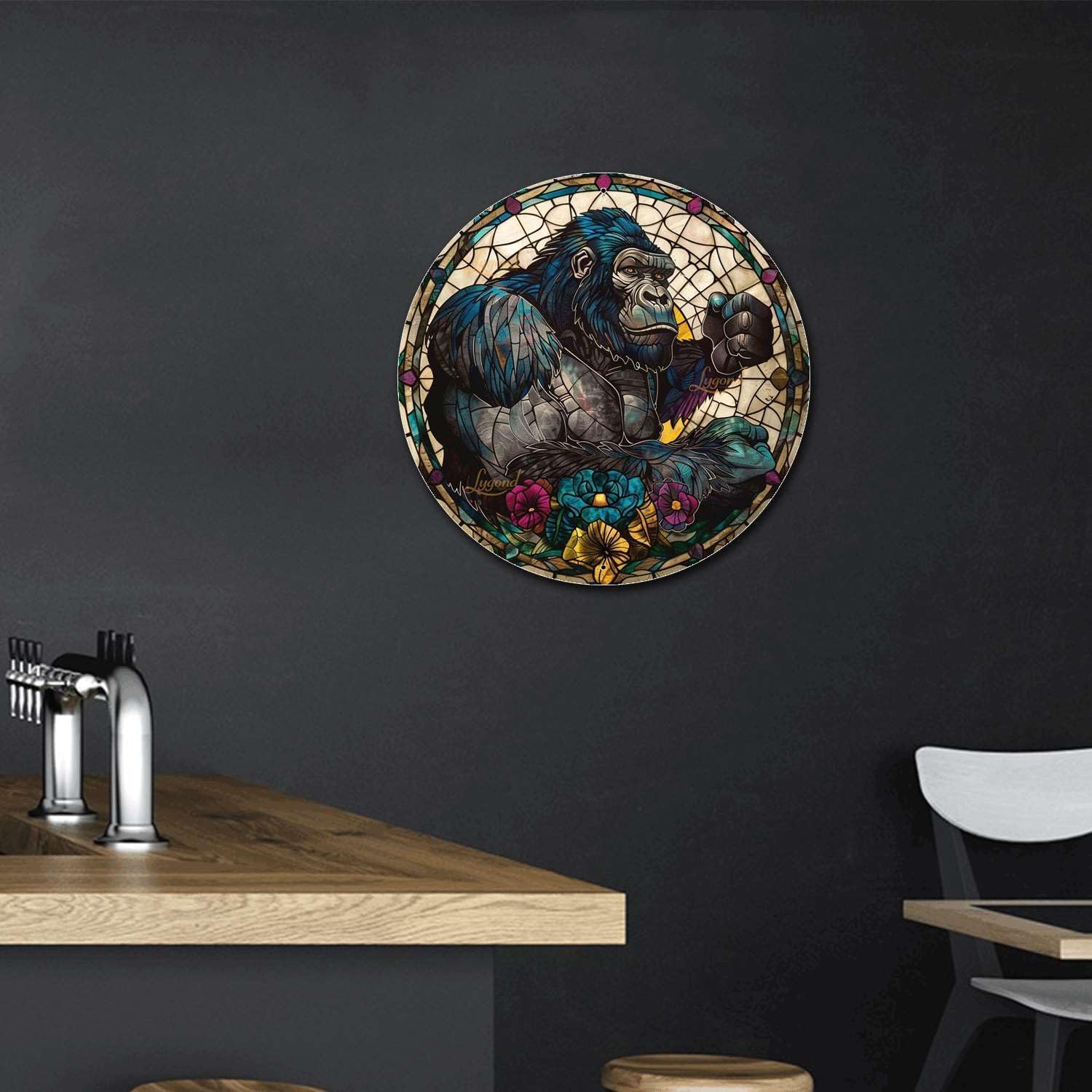 Lygond Metal Sign Tin Sign Circular Stained Glass Gorilla Wall Art for Club 12×12 Inches