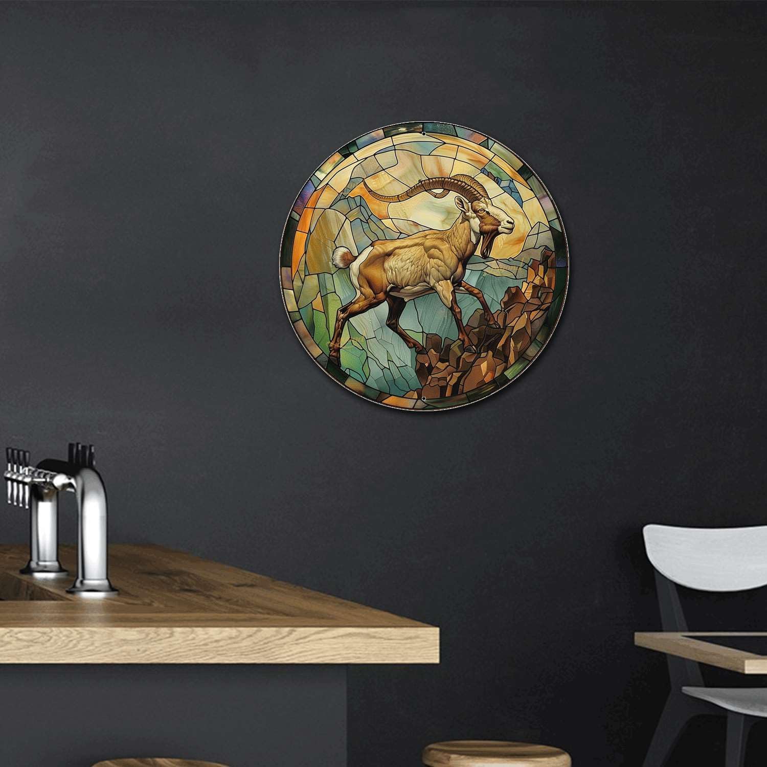 Lygond Metal Sign Tin Sign Circular Stained Glass Mountain Goat Garden Metal Sign For Bar 8×8 Inches