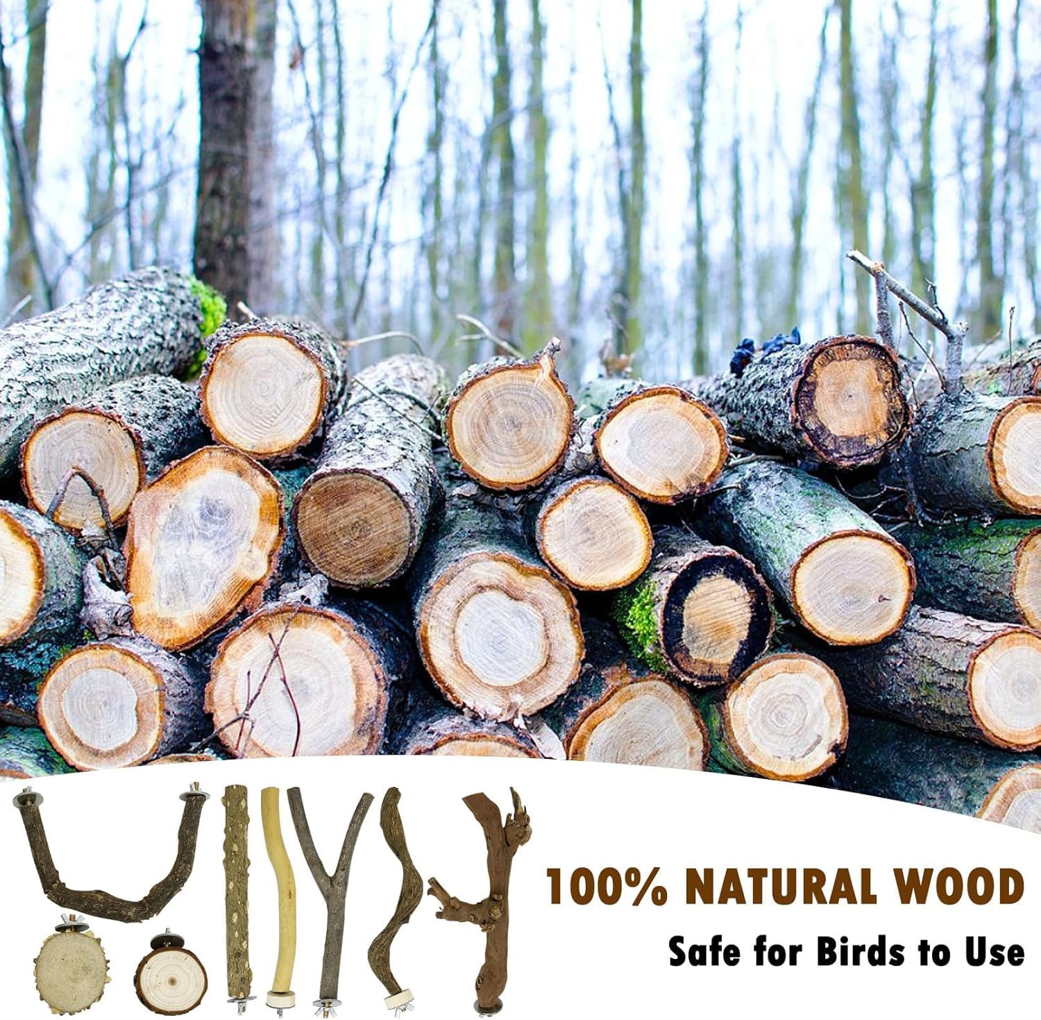 - Different Kinds of Bird Perches: Our natural bird wooden stand includes 8 different types of perches, 1 x forked branch bird perch,1 x U-Shaped bird perch, 2 x round platforms, and 4 x regular parrot perches.We provide the parts and various types of perches needed to assemble this bird perch stand to simulate a natural habitat for your birds and promote their natural behavior