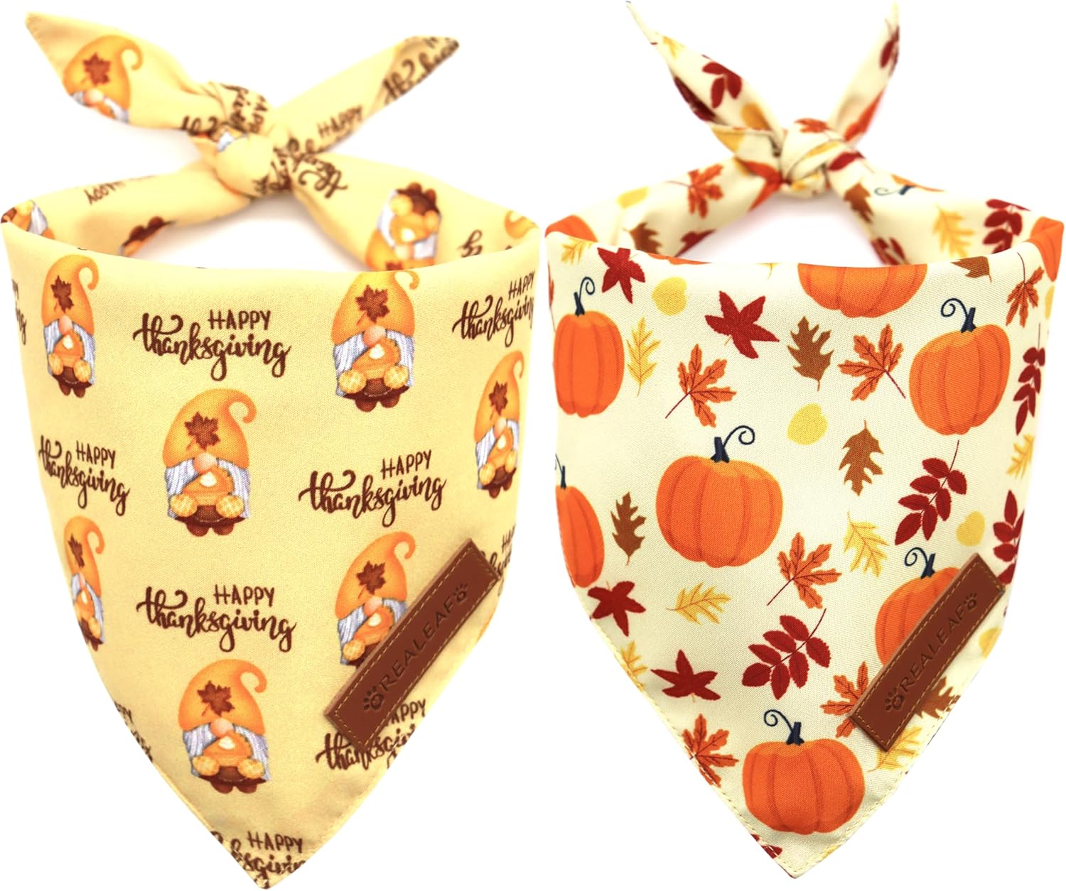 Realeaf Thanksgiving Dog Bandanas 2 Pack, Pumpkins and Happy Thanksgiving Pet Scarf for Boy and Girl, Premium Durable Fabric, Reversible Holiday Bandana for Small and Medium Dogs Pets (Small)